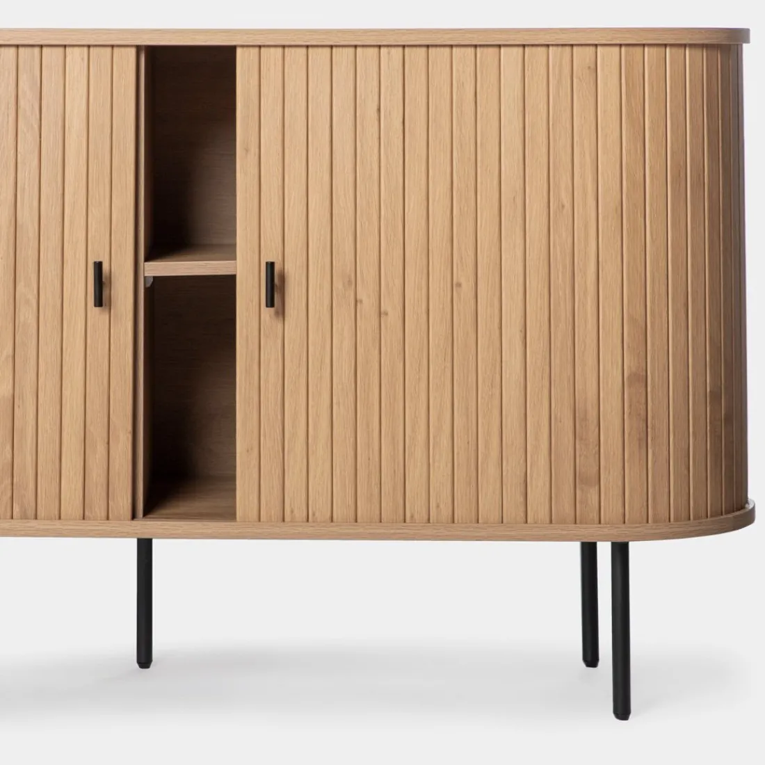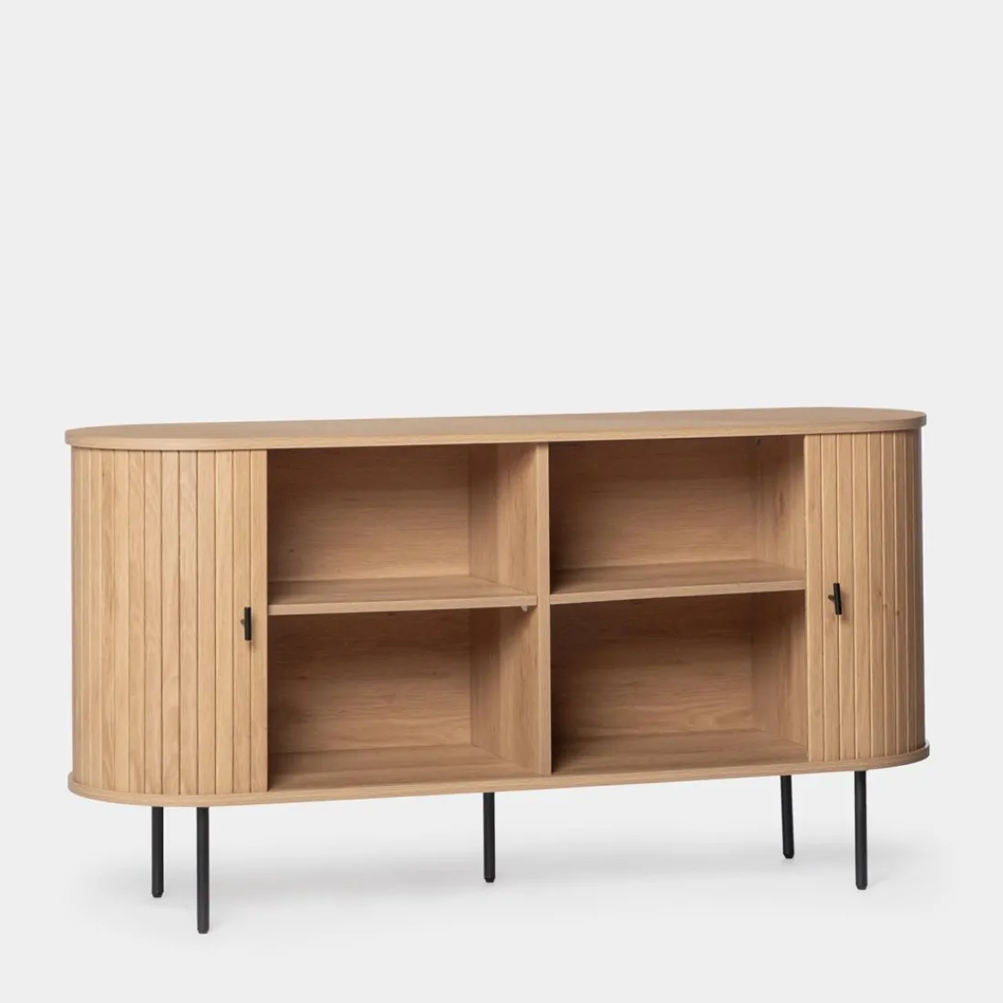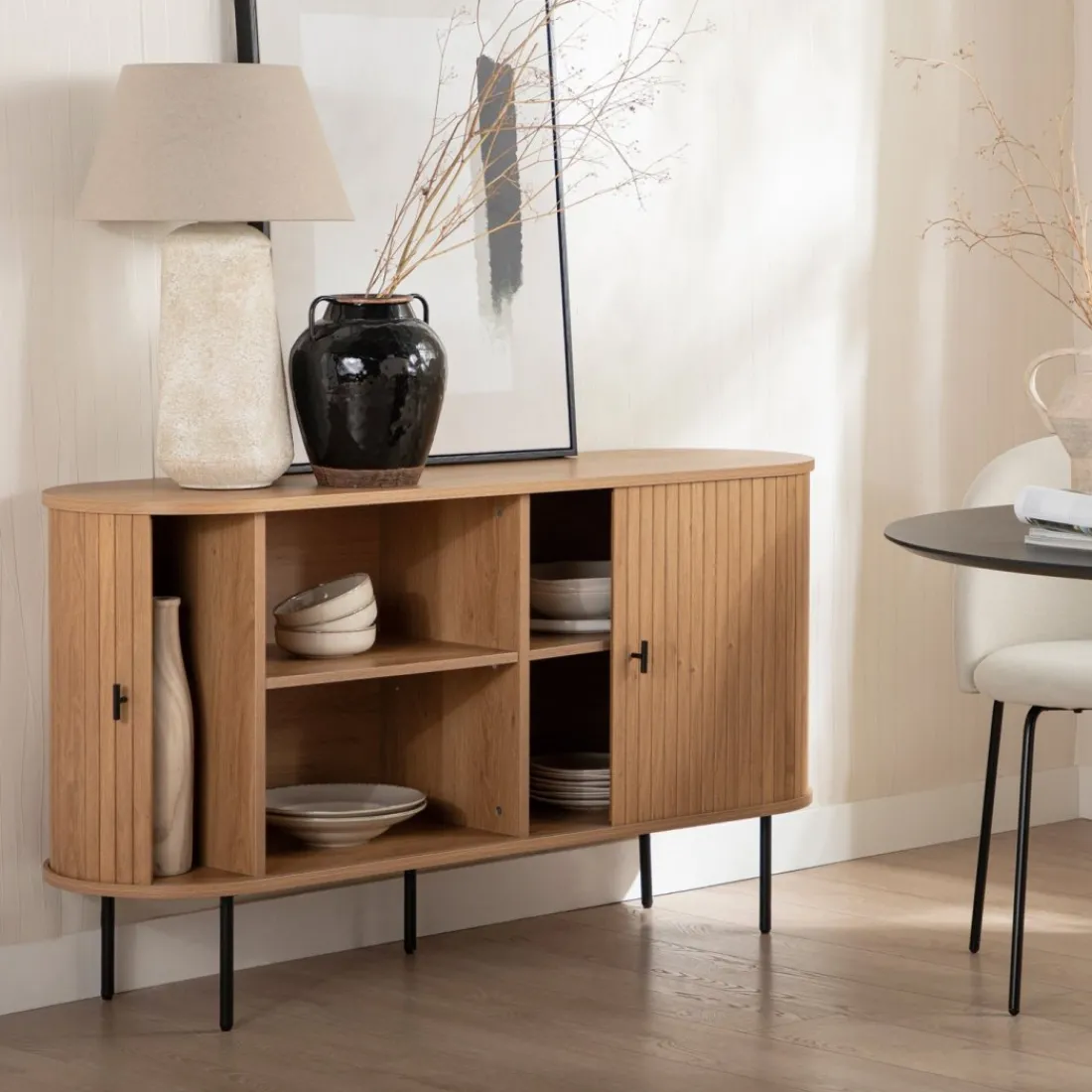 El aparador Breda en madera color natural, es la opción perfecta si buscas añadir un toque distintivo y moderno a tu salón. Su forma redondeada y sus dos puertas correderas de estilo persiana no pasan desapercibidas y además proporcionan un amplio espacio de almacenamiento. Combínalo con el mueble de TV Breda y consigue un look completo y moderno para tu hogar.