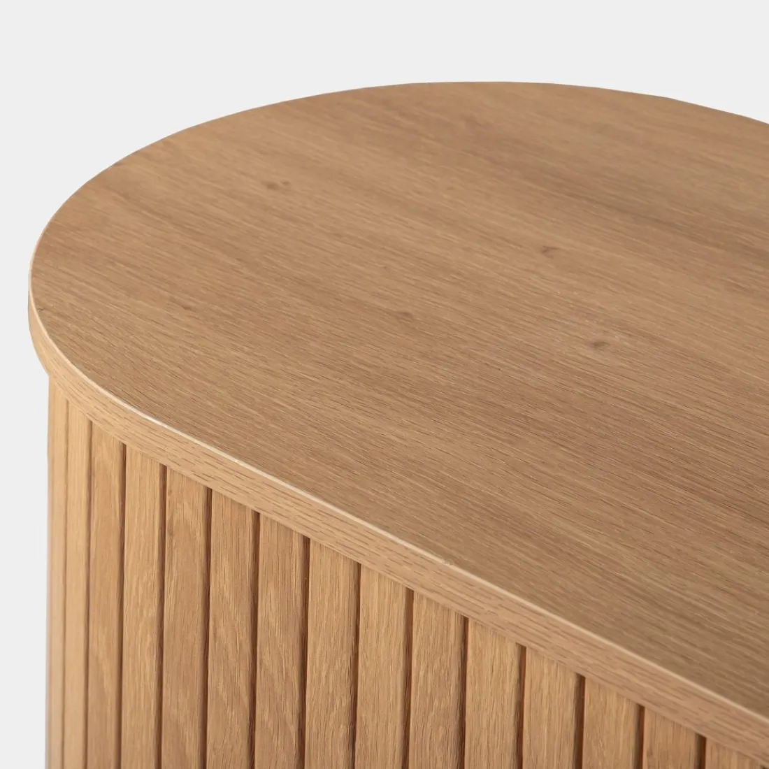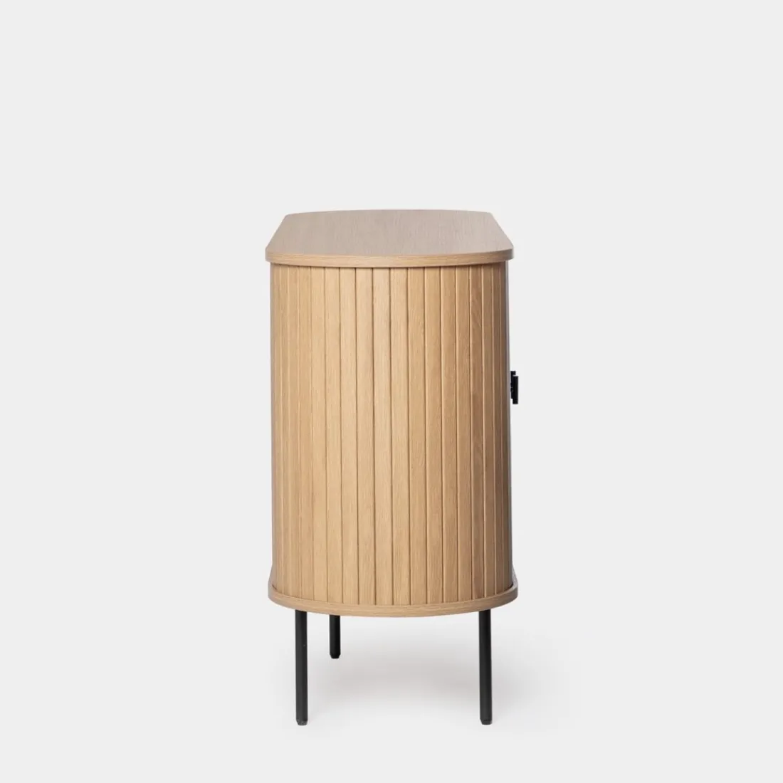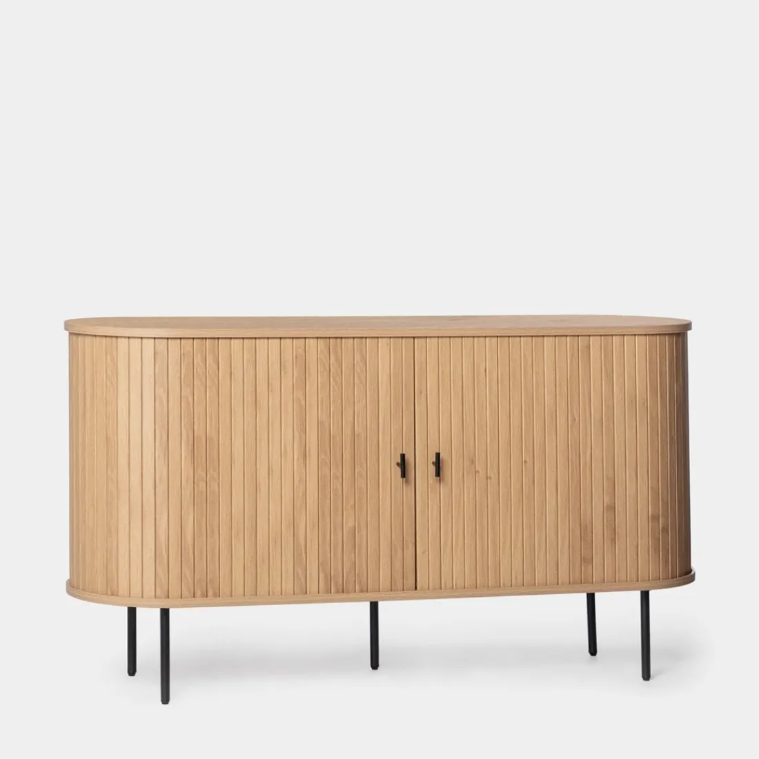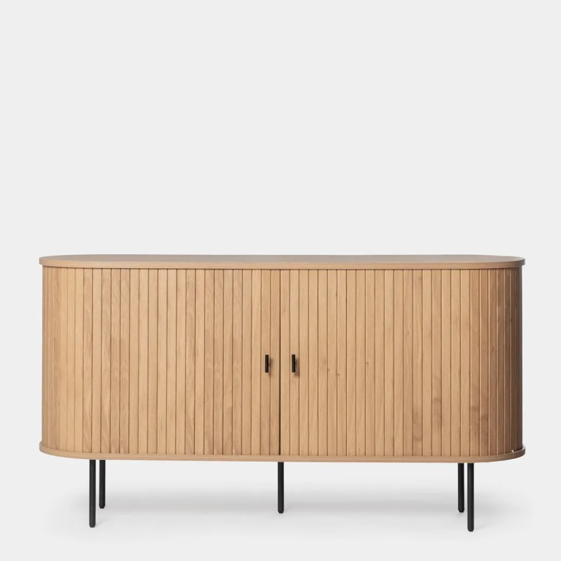 El aparador Breda en madera color natural, es la opción perfecta si buscas añadir un toque distintivo y moderno a tu salón. Su forma redondeada y sus dos puertas correderas de estilo persiana no pasan desapercibidas y además proporcionan un amplio espacio de almacenamiento. Combínalo con el mueble de TV Breda y consigue un look completo y moderno para tu hogar.