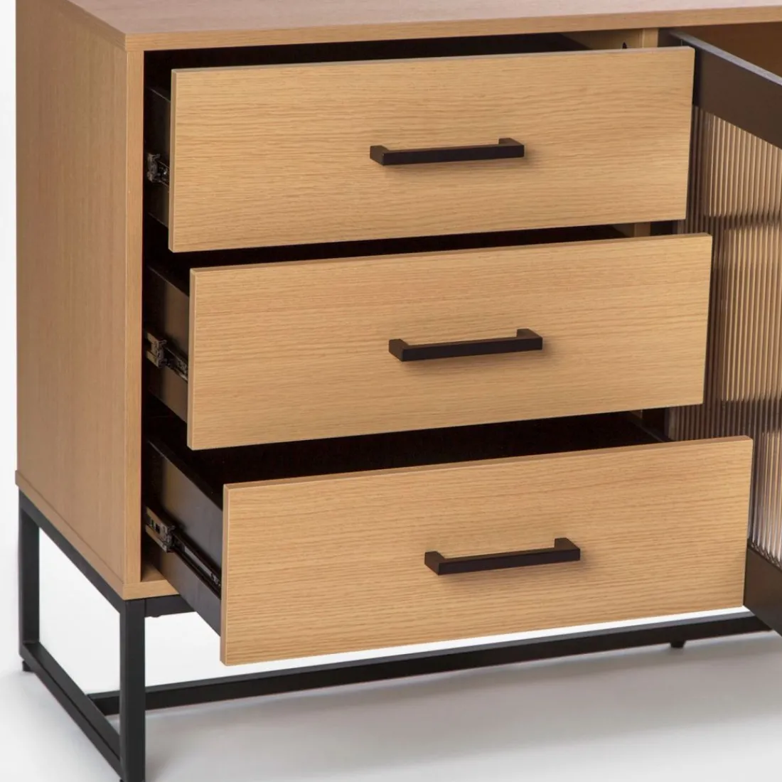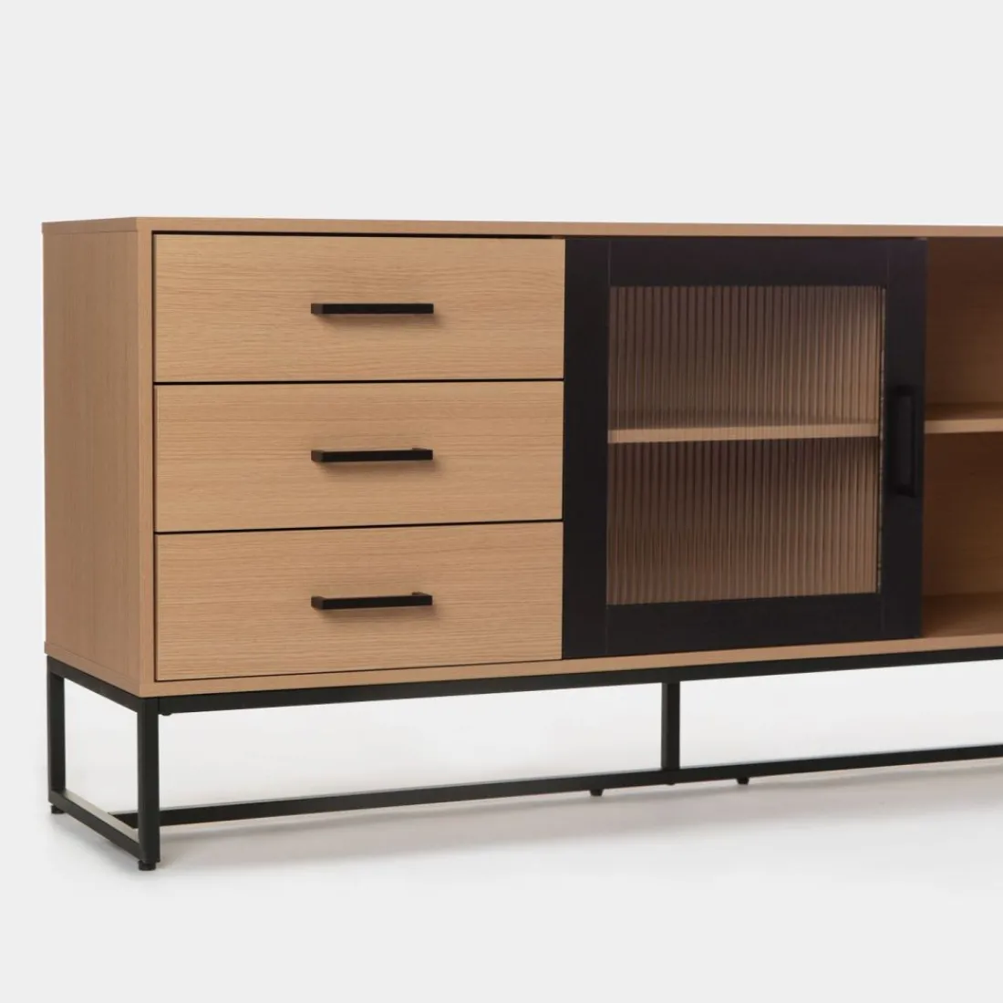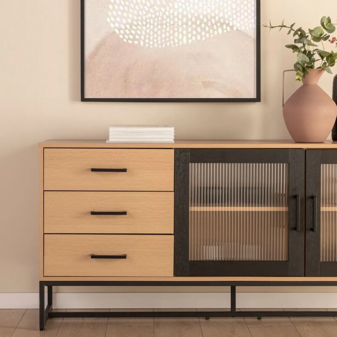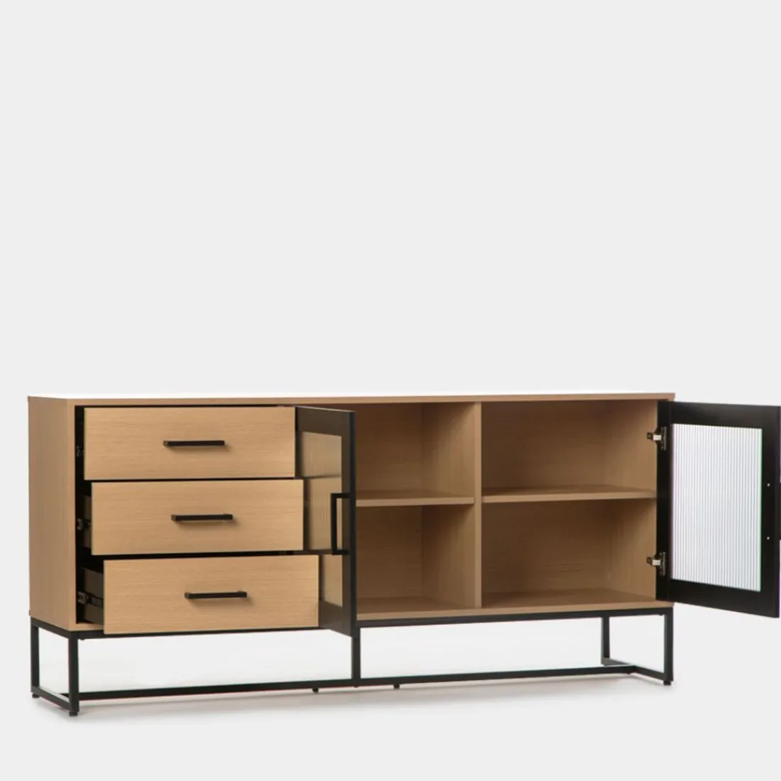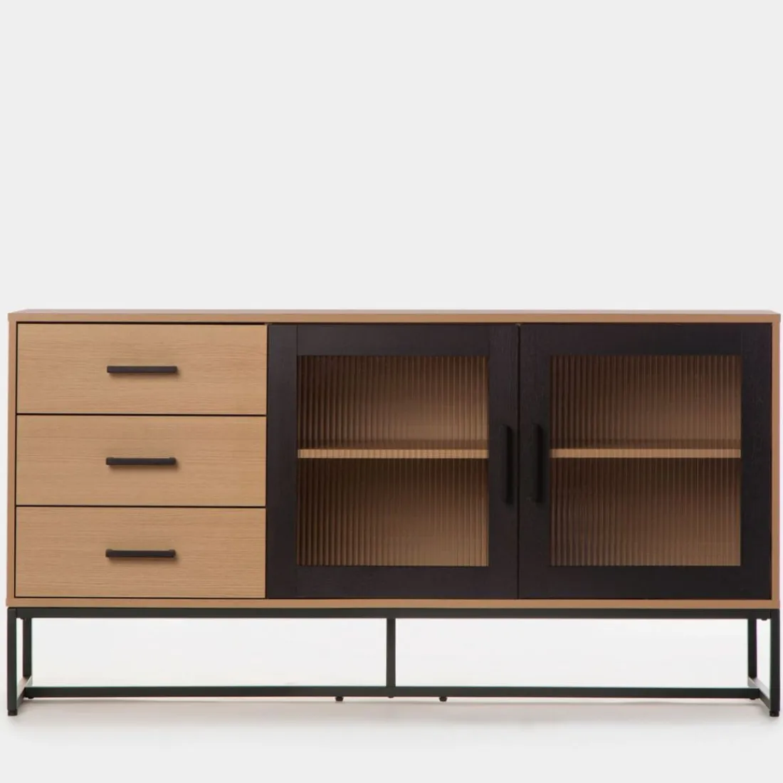 El aparador Milan de inspiración industrial será tu perfecto aliado si quieres derrochar estilo. Su combinación de vidrio ondulado, roble y detalles en negro le conceden mucha personalidad.Está dotado de dos puertas y cajones en cuyo interior puedes guardar todo aquello que desees. Es una pieza de gran capacidad que puede emplazarse tanto en un comedor, como en un despacho u oficina.Para mayor estabilidad del mueble, aconsejamos su anclaje a la pared. Combínalo con otras piezas de la colección.