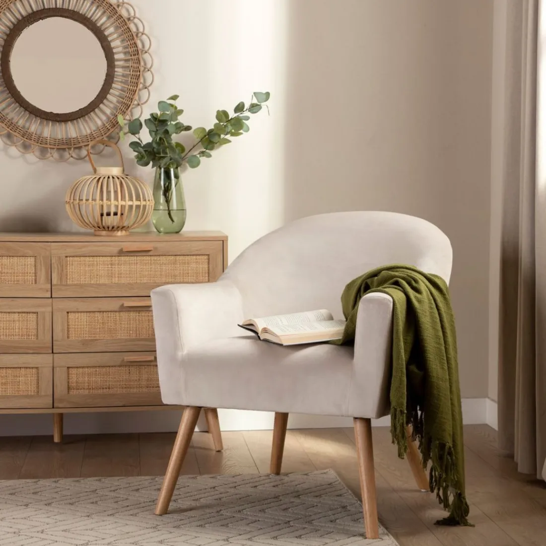 La butaca de lectura Lauren tapizada en terciopelo beige es el asiento perfecto para completar la zona de salón/comedor. Su asiento, respaldo y reposabrazos amplios la convierten en una butaca ideal para la lectura y el descanso. Está disponible en diferentes tapizados para que puedas escoger el que mejor encaje con tu estilo.