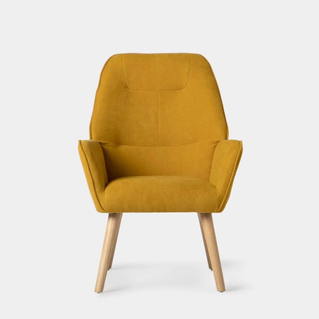 La butaca de lectura Valery tapizada en color mostaza encaja en cualquier salón, dormitorio o recibidor. Tiene un respaldo alto y unos mullidos reposabrazos que hacen que sea muy cómoda y confortable. Está disponible en diferentes tapizados para que puedas escoger el que mejor encaje con tu estilo.