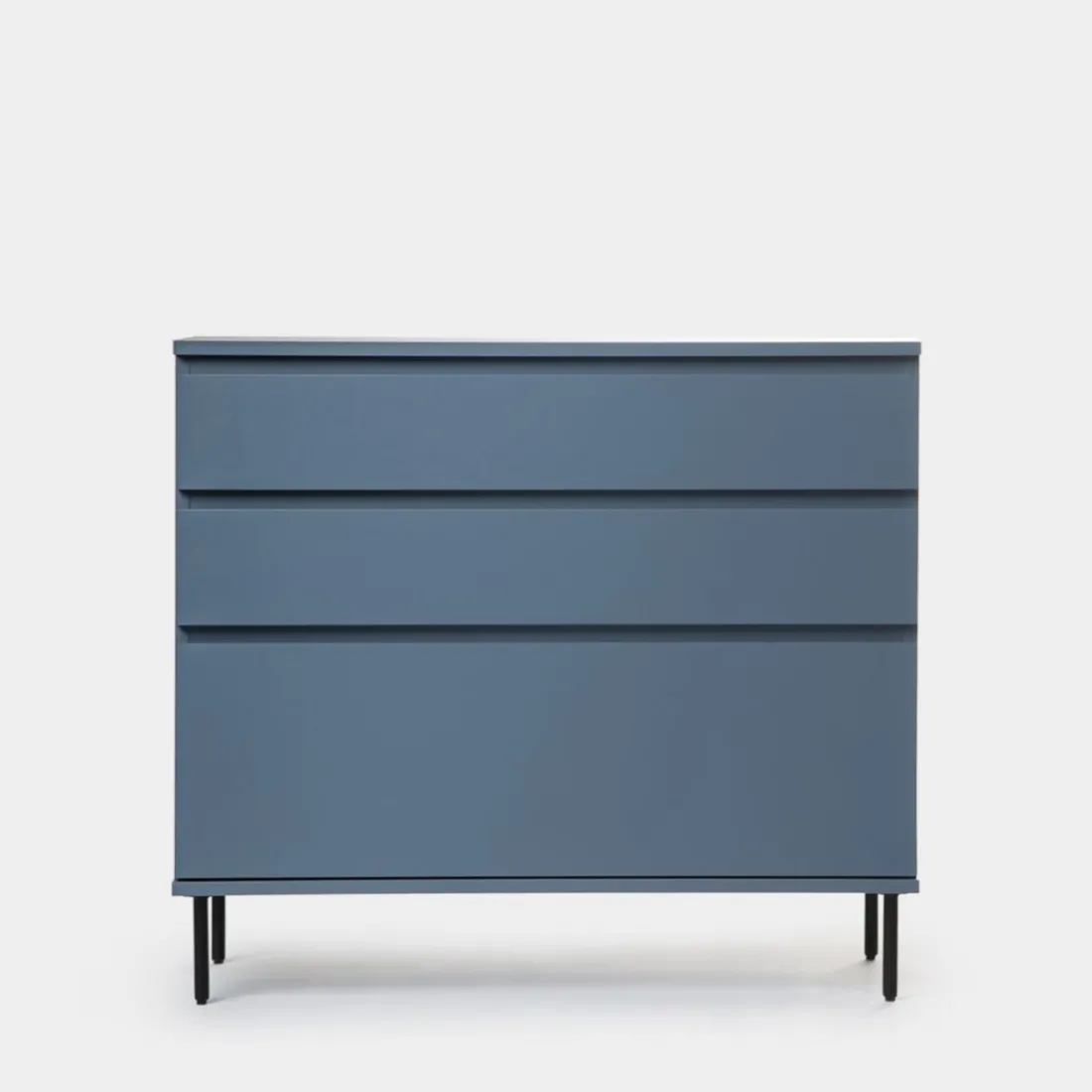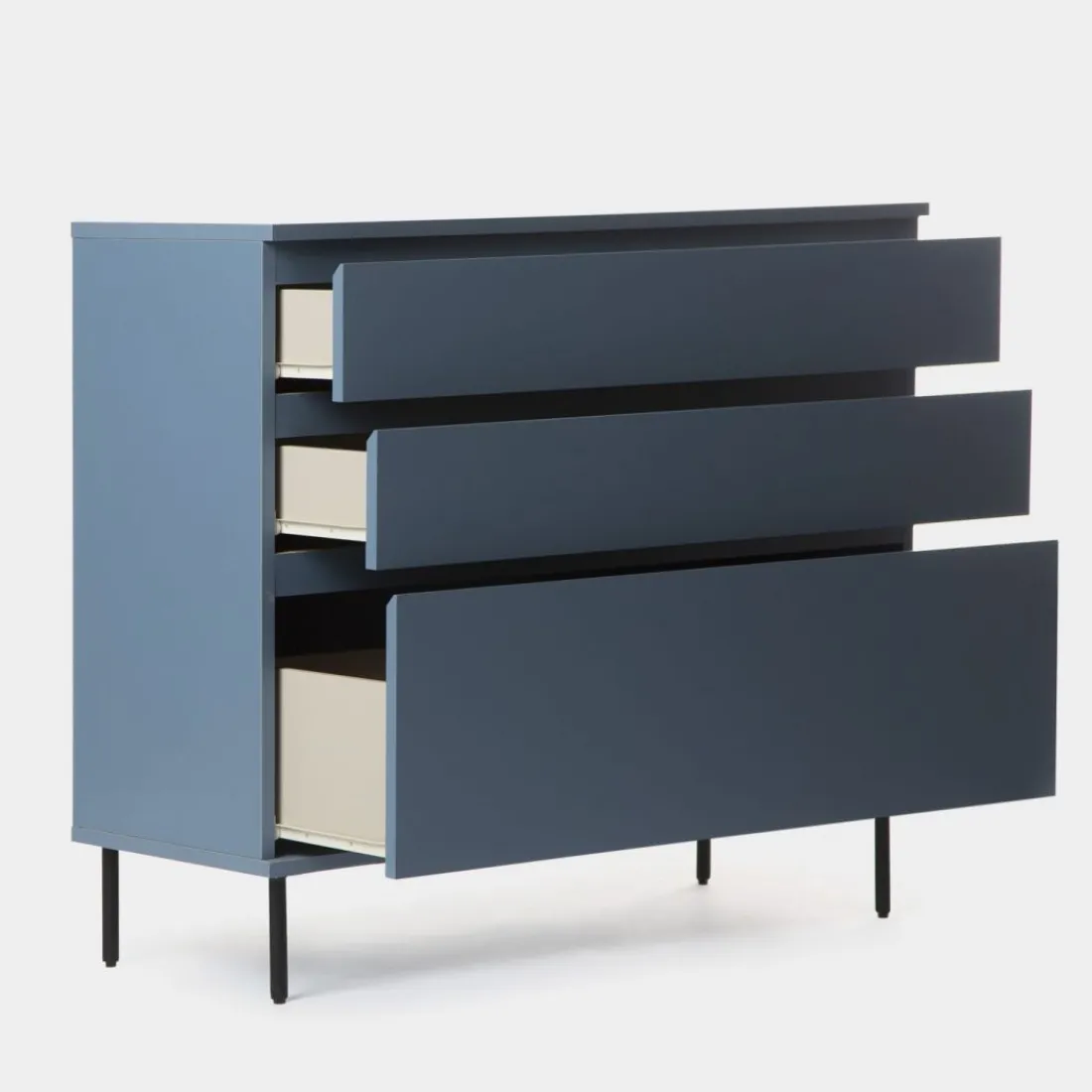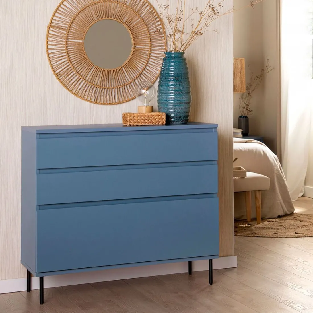 Aporta personalidad y estilo a tu dormitorio con la cómoda en madera color azul Esben. Cuenta con dos amplios cajones y un tercer cajón contenedor de mayor capacidad perfecto para almacenar ropa más voluminosa. Para mayor estabilidad del mueble, aconsejamos su anclaje a la pared.
