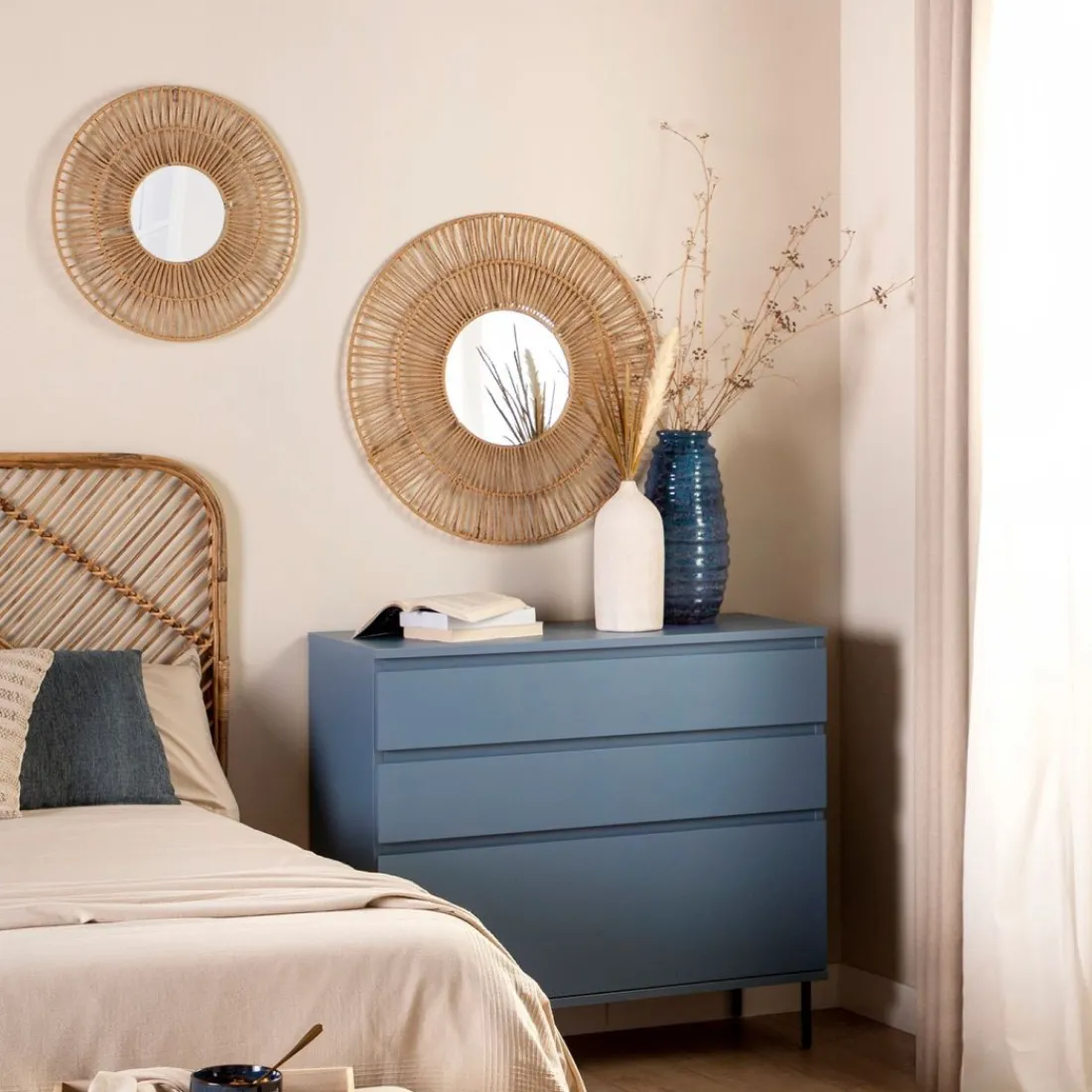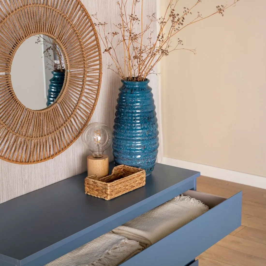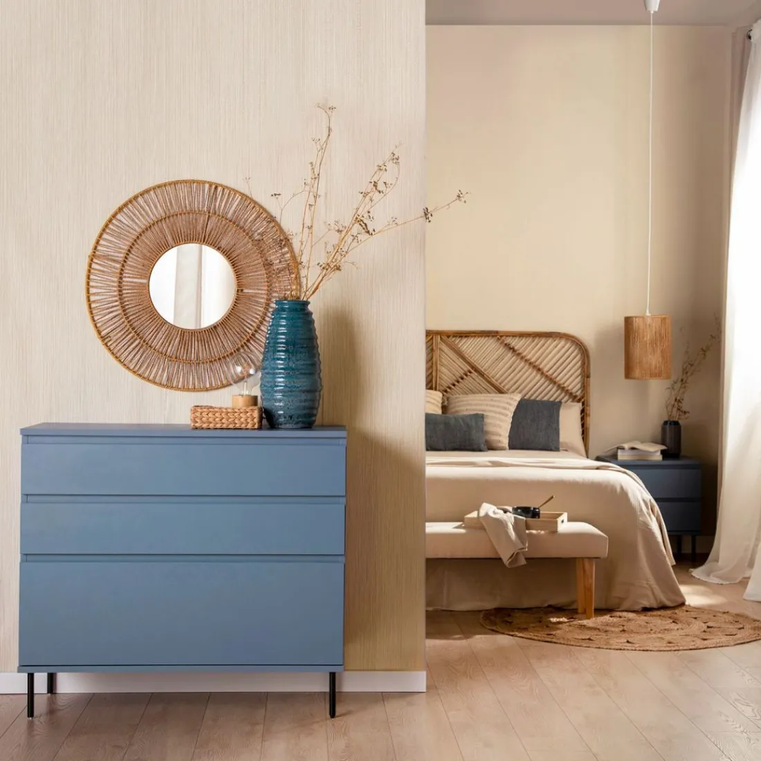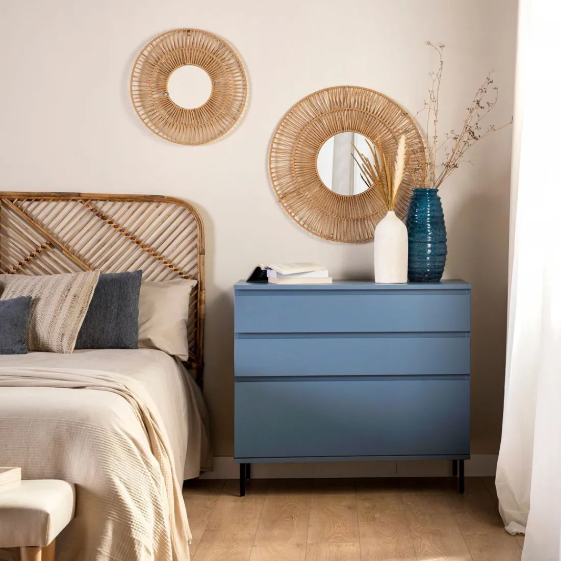 Aporta personalidad y estilo a tu dormitorio con la cómoda en madera color azul Esben. Cuenta con dos amplios cajones y un tercer cajón contenedor de mayor capacidad perfecto para almacenar ropa más voluminosa. Para mayor estabilidad del mueble, aconsejamos su anclaje a la pared.