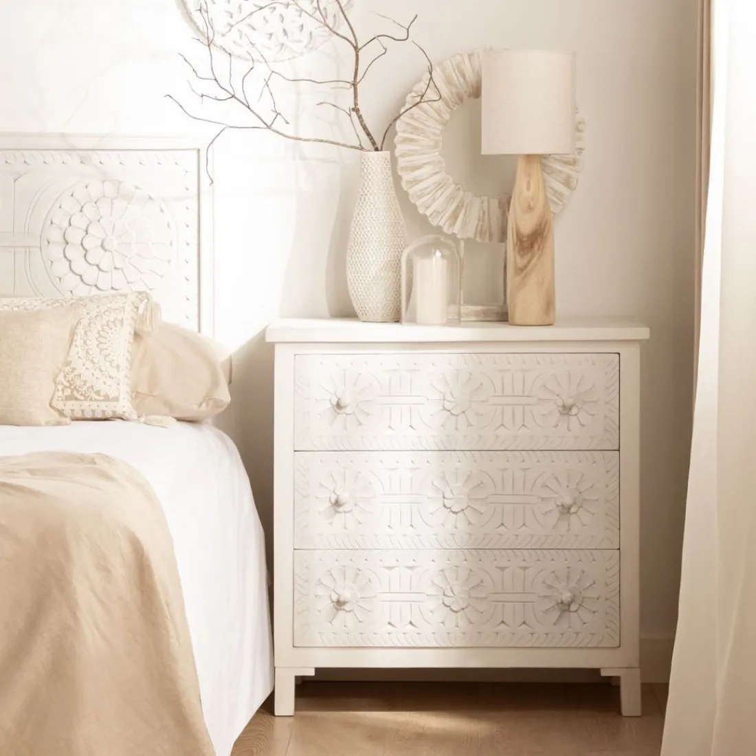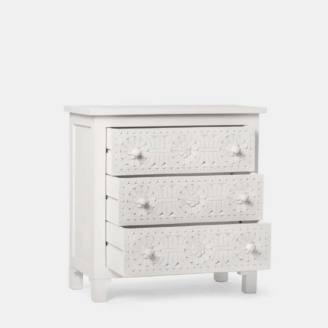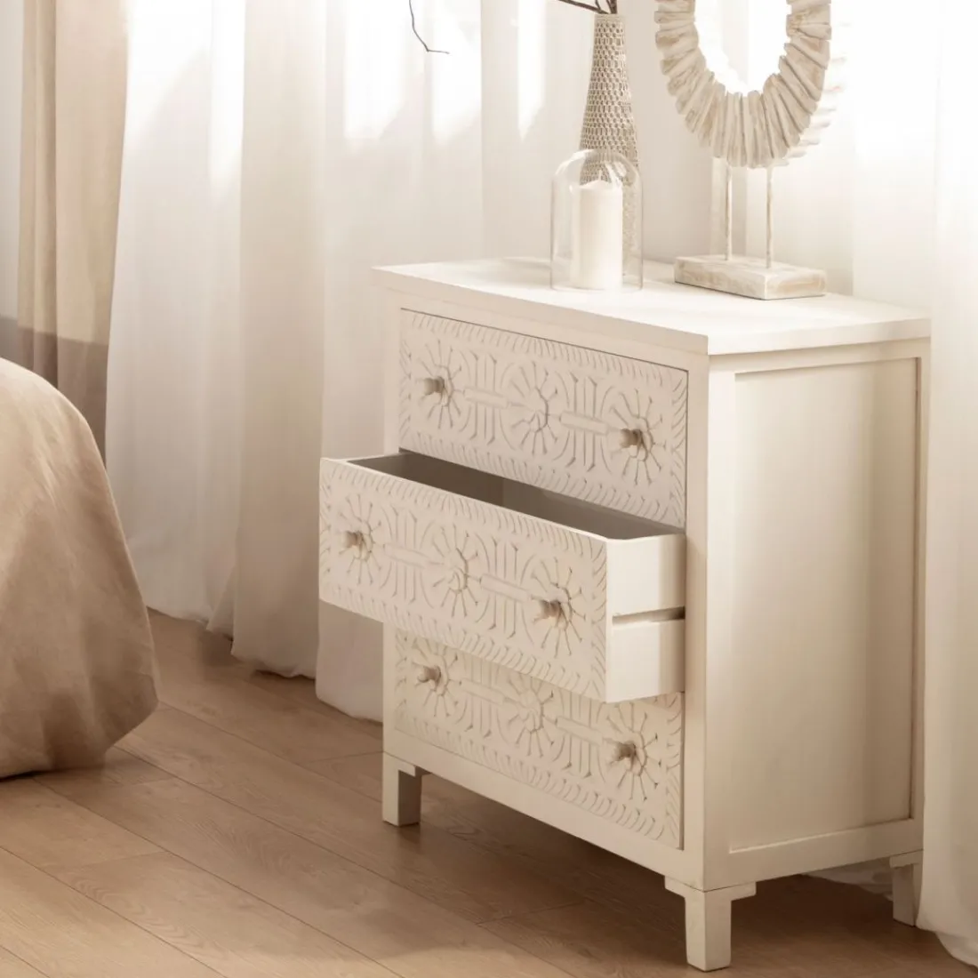 La cómoda en blanco vintage Iraya aportará estilo y personalidad a tu dormitorio. Sus tres cajones de gran capacidad te ayudarán a organizar y almacenar todas tus pertenencias. Para mayor estabilidad del mueble, aconsejamos su anclaje a la pared. Combínalo con el resto de la colección y consigue el look completo.