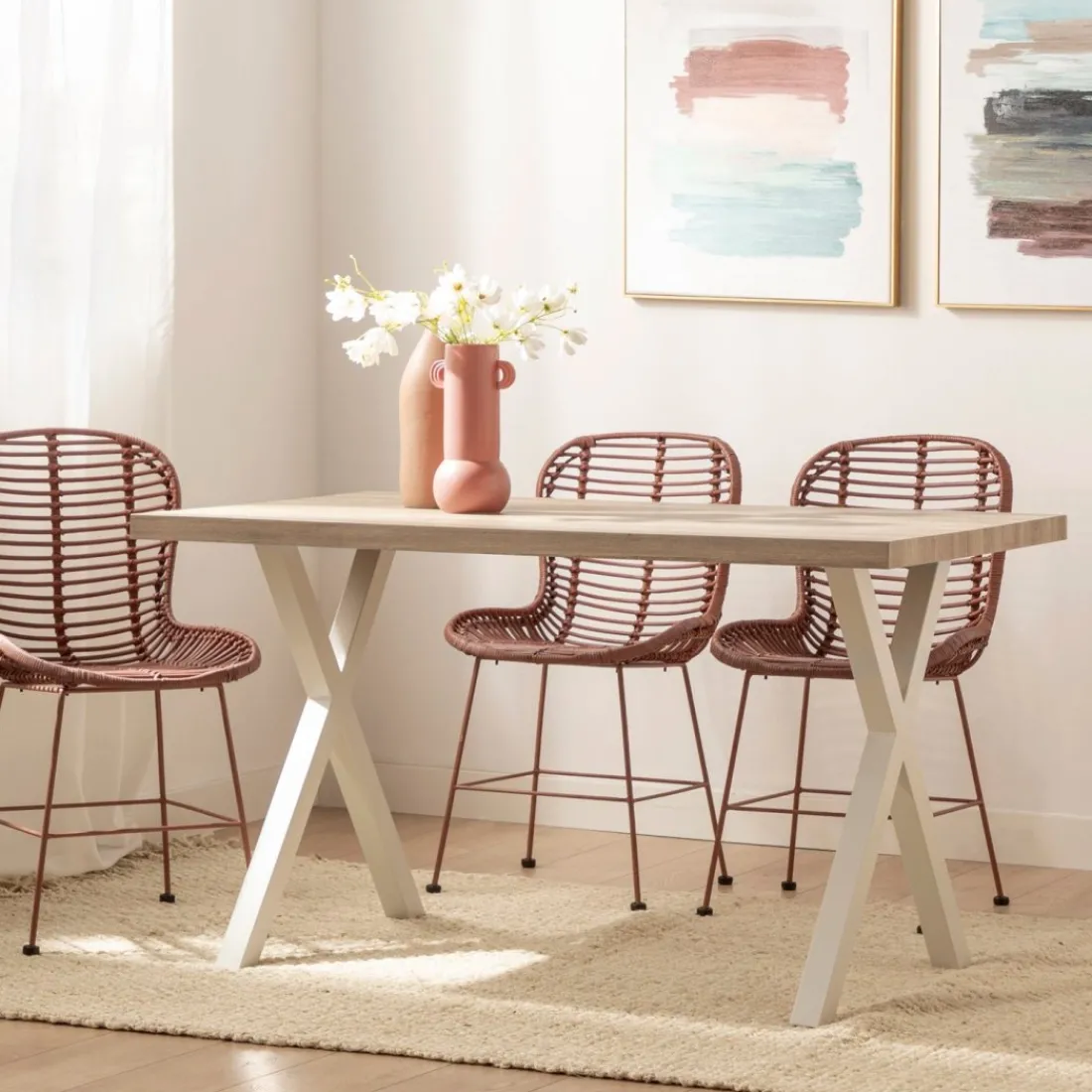Potencia tu salón con la elegancia de la mesa de comedor rectangular Parks. Con su sobre de acabado natural y sus patas metálicas blancas en forma de cruz, añade un toque contemporáneo y de moda a cualquier entorno. Con capacidad para 6 comensales, es la opción ideal para compartir momentos memorables con tus seres queridos. Su estilo atemporal la convierte en el complemento perfecto para tu salón comedor, cocina o incluso como mesa de reuniones en tu espacio de trabajo.