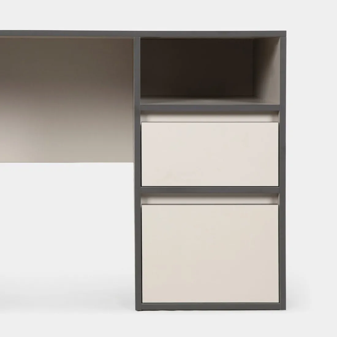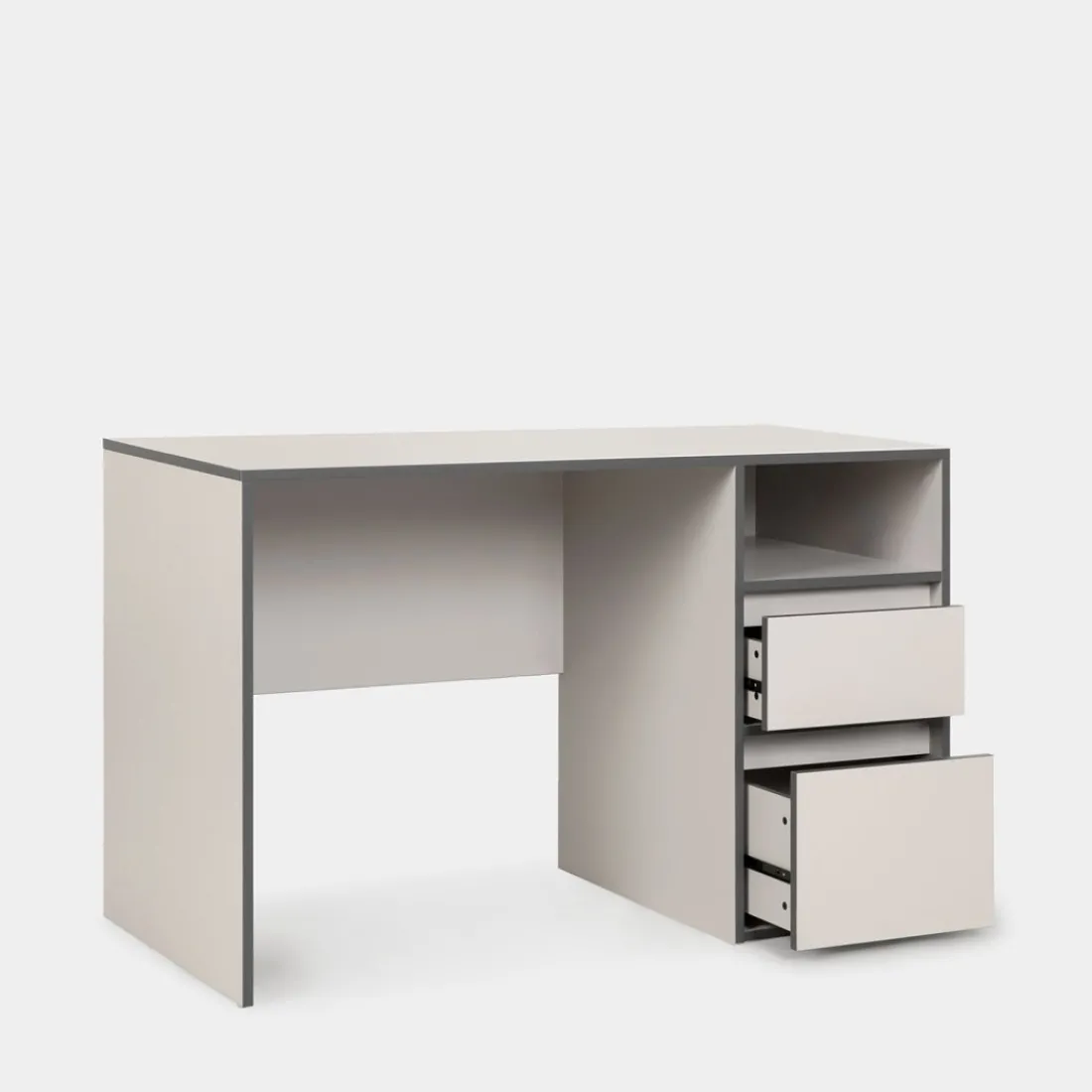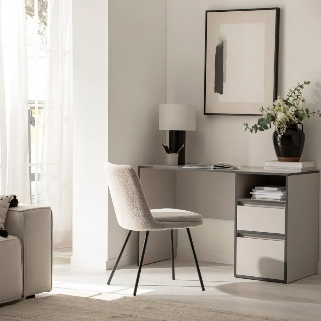 Aprovecha al máximo cada día de trabajo con el escritorio Kamila. Equipado con un hueco superior y dos cajones espaciosos, proporciona la organización ideal para accesorios y documentos. Su acabado en gris perla aporta luminosidad, mientras que sus cantos en gris oscuro añaden un contraste sofisticado. Perfecto para oficinas en casa y estudios, Kamila combina funcionalidad con un estilo moderno.