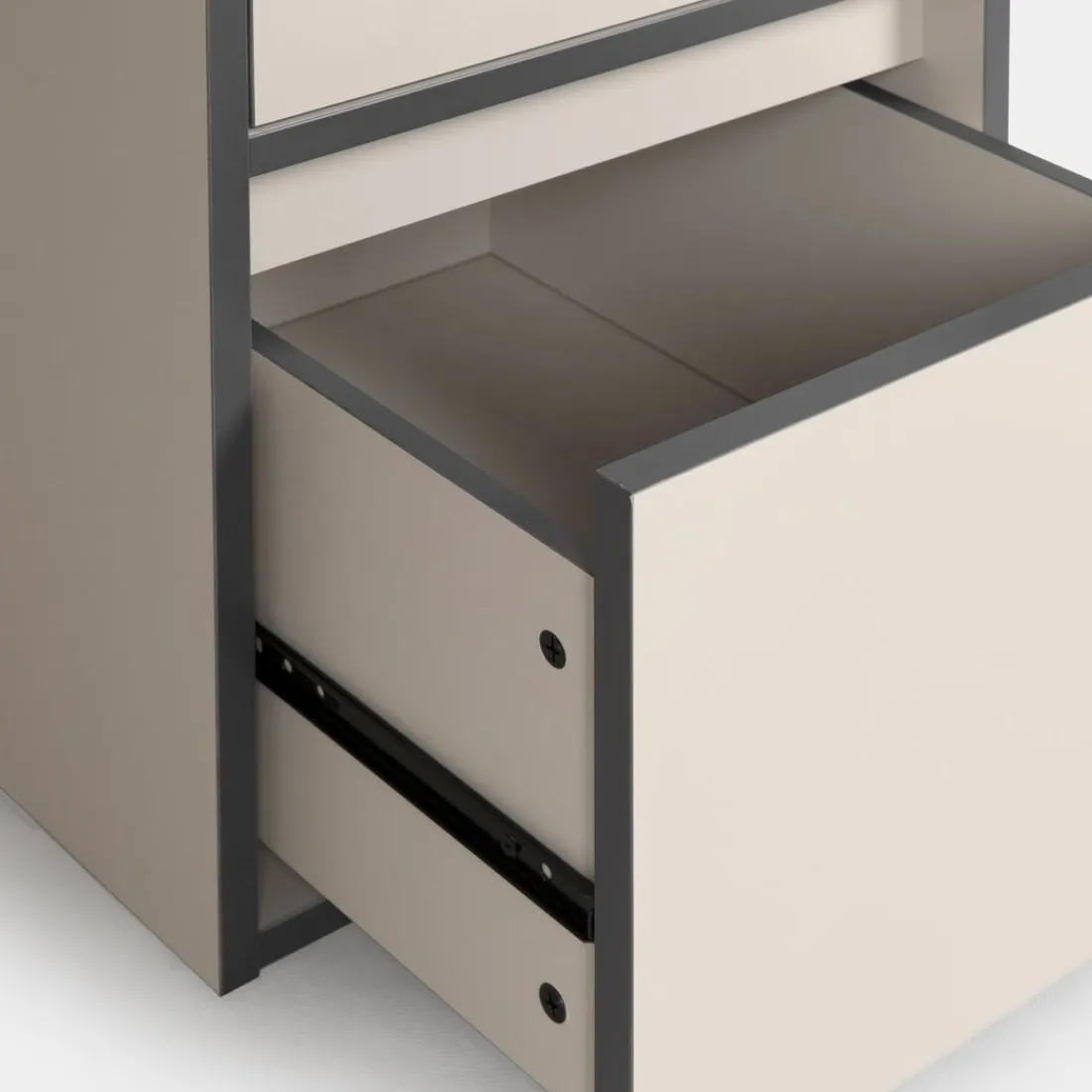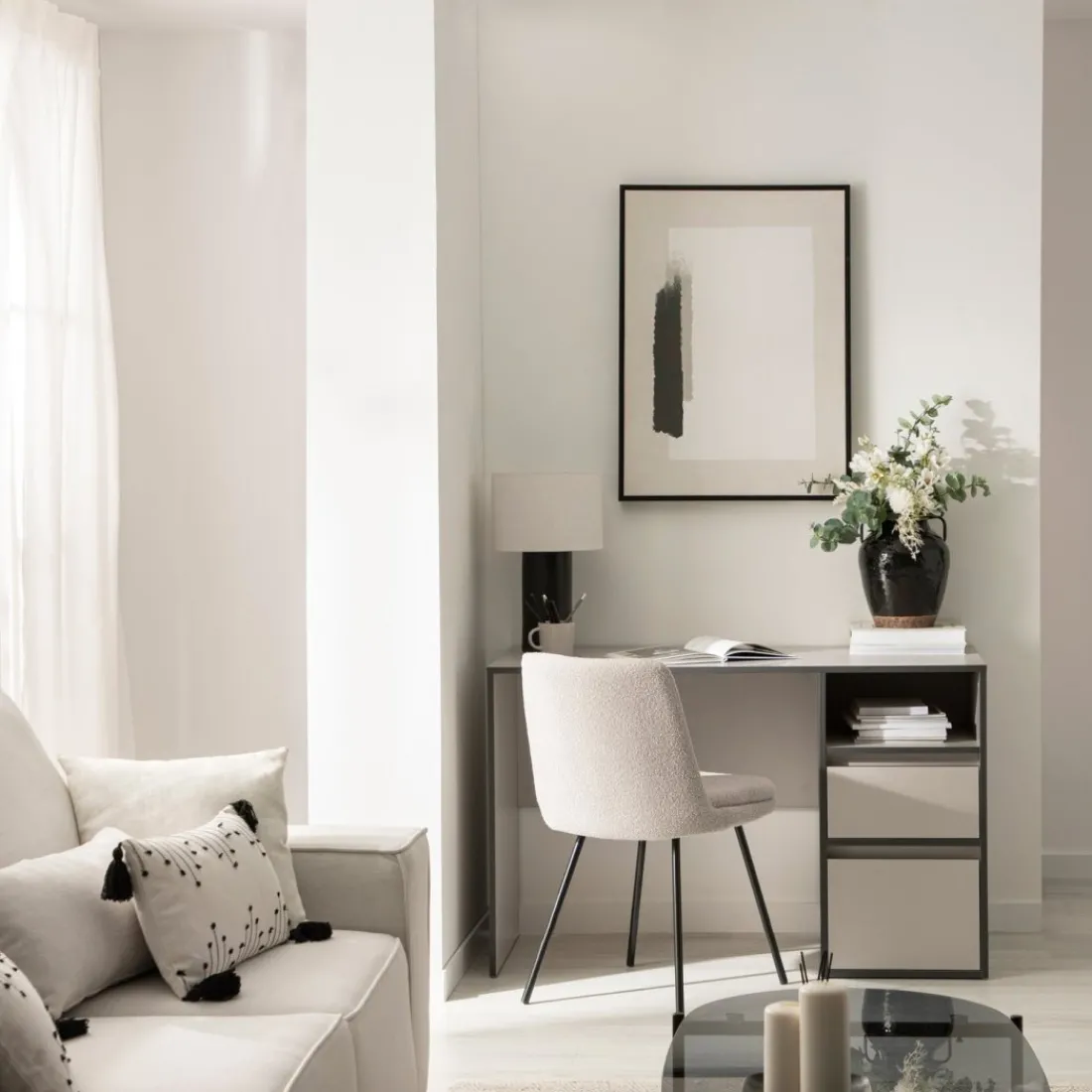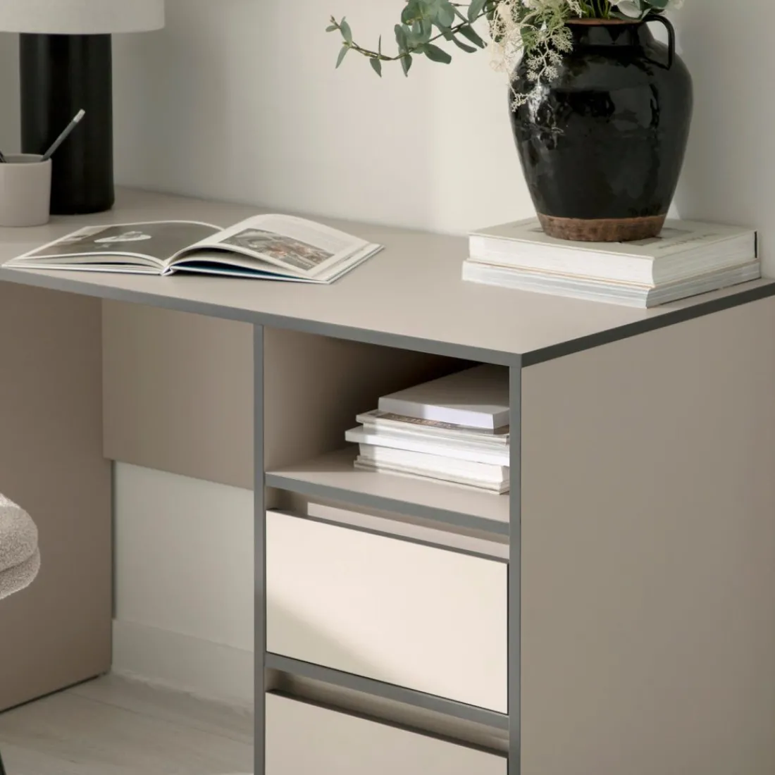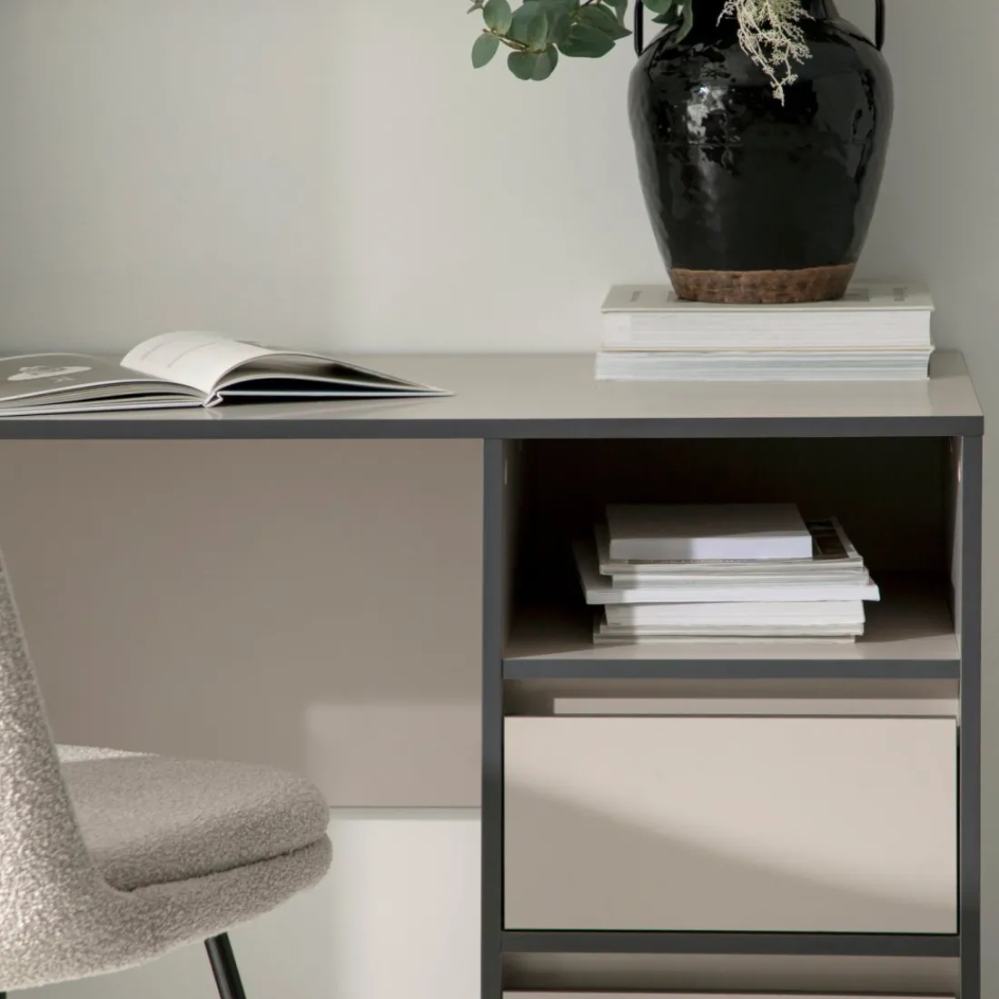 Aprovecha al máximo cada día de trabajo con el escritorio Kamila. Equipado con un hueco superior y dos cajones espaciosos, proporciona la organización ideal para accesorios y documentos. Su acabado en gris perla aporta luminosidad, mientras que sus cantos en gris oscuro añaden un contraste sofisticado. Perfecto para oficinas en casa y estudios, Kamila combina funcionalidad con un estilo moderno.