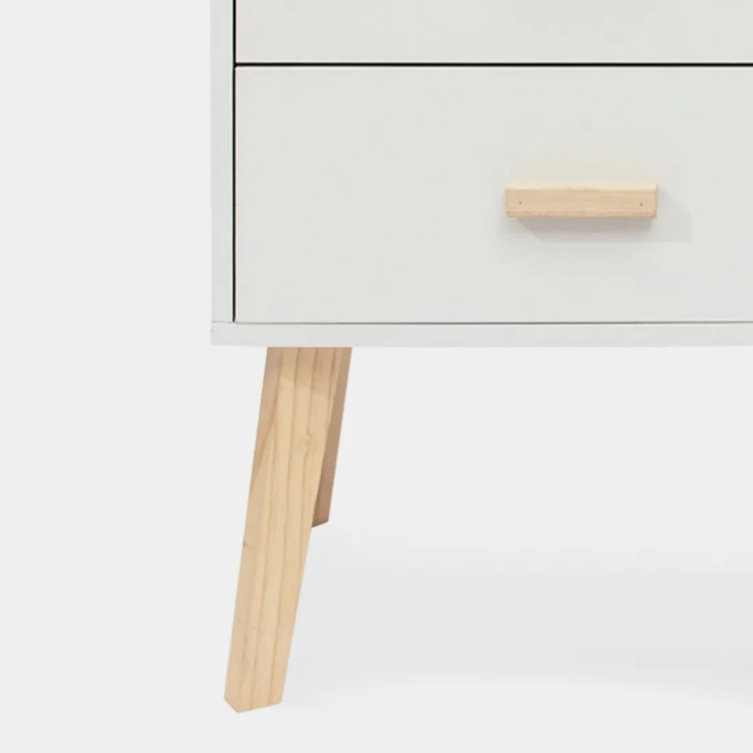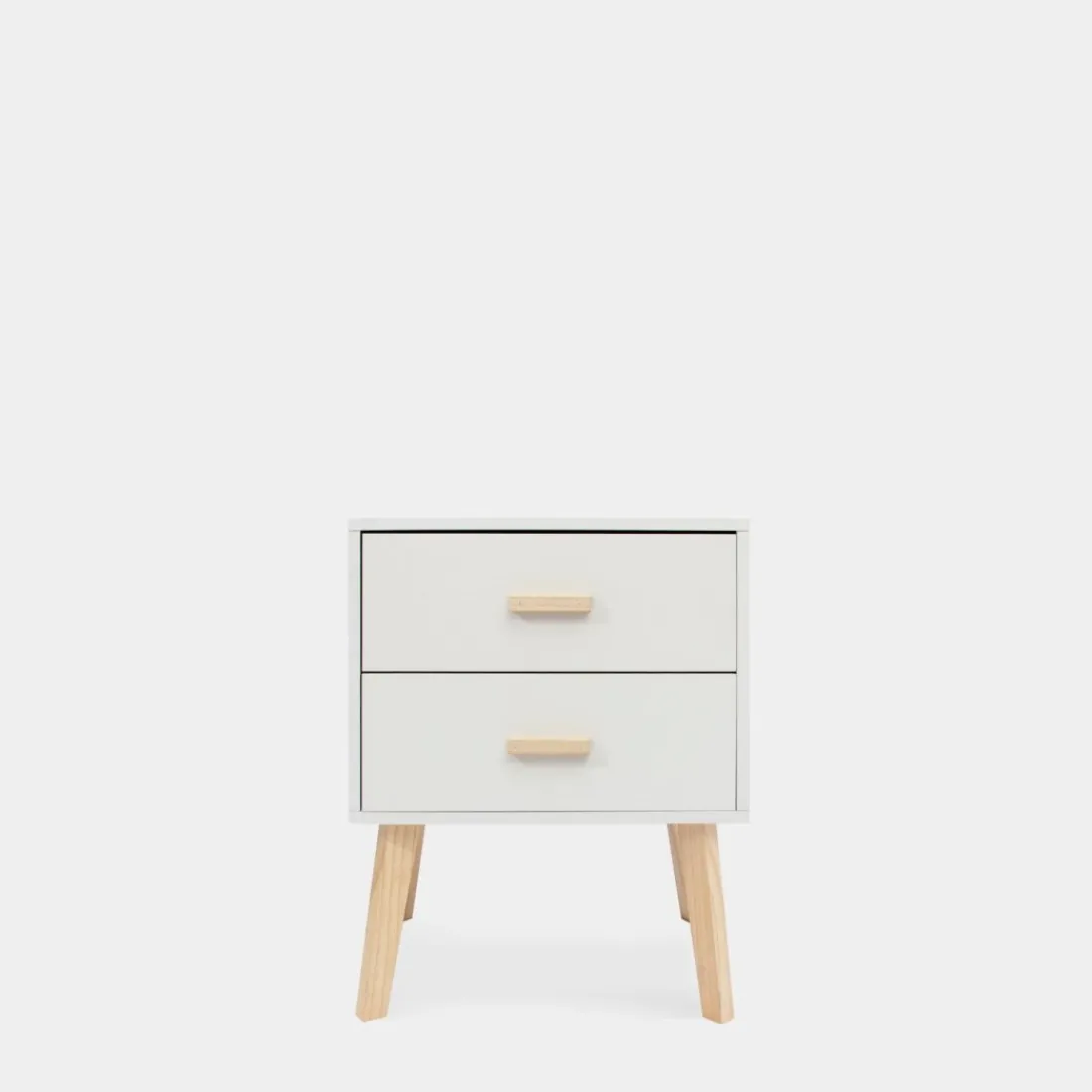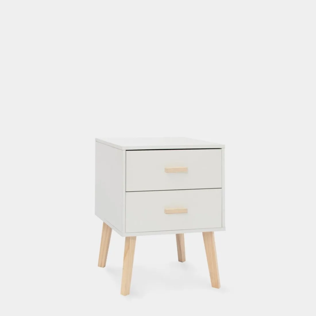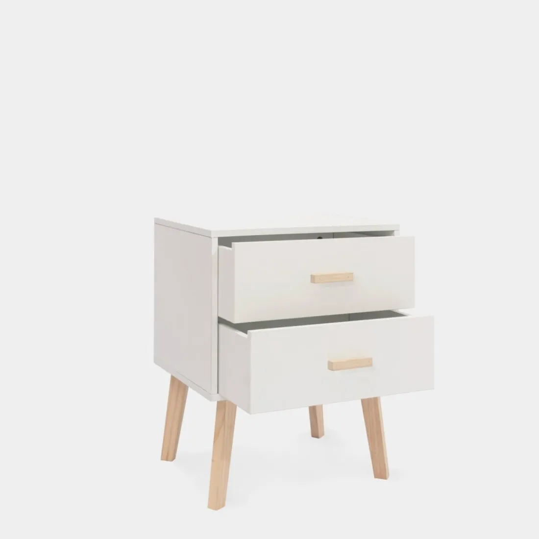 Transforma tu dormitorio con la sofisticada mesita de noche Laren. Fabricada en madera de color blanco, esta pieza armoniza la frescura del blanco con elegantes detalles en madera de pino. Sus dos amplios cajones brindan un almacenamiento práctico, ideal para mantener tus objetos personales organizados y siempre al alcance.