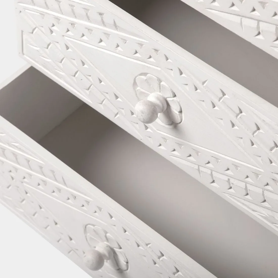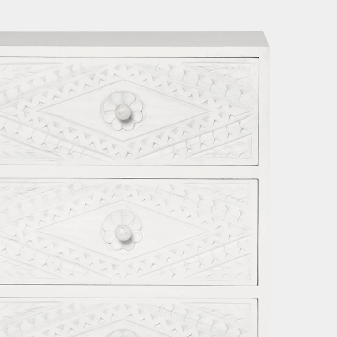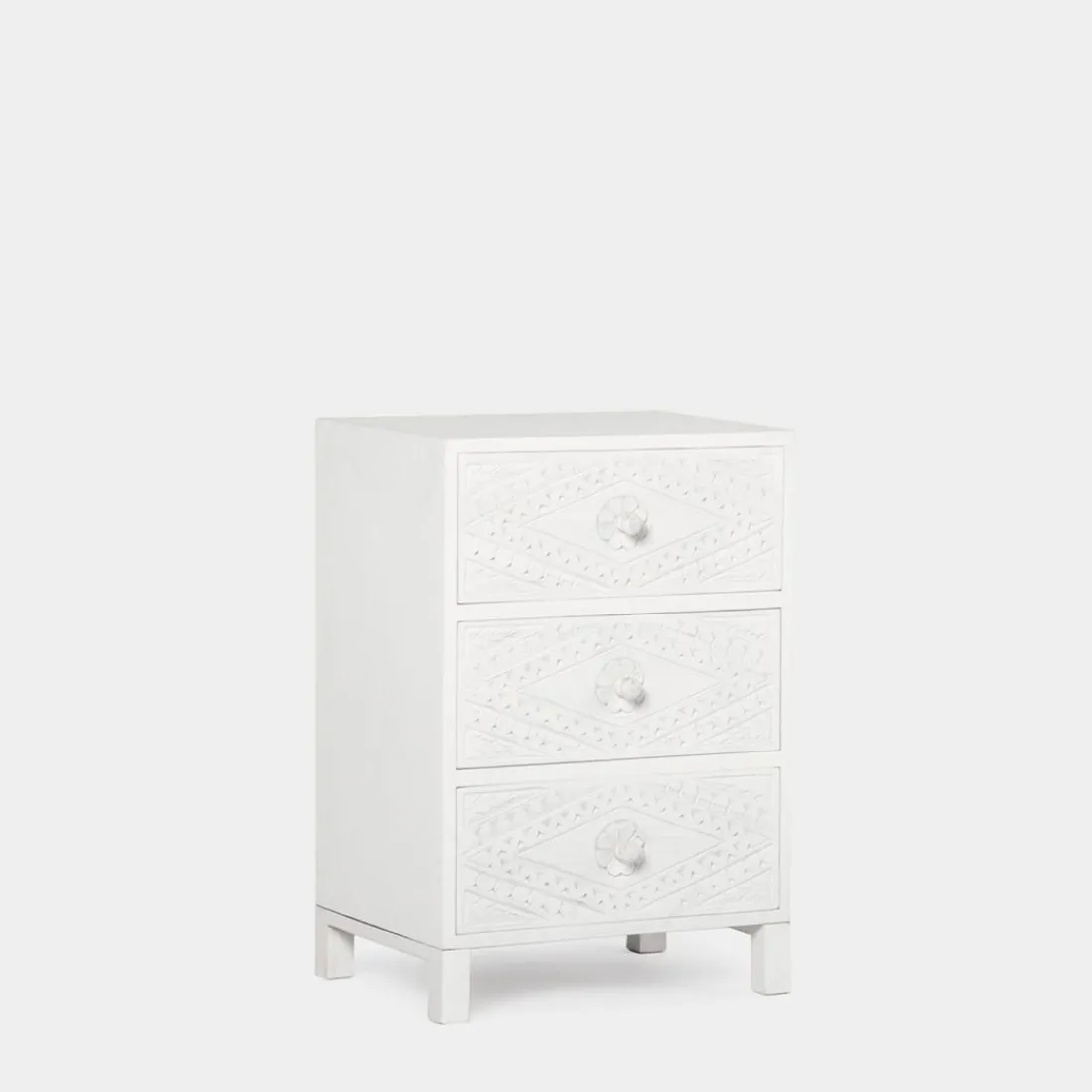 La mesita de noche de 3 cajones en blanco vintage Sinta es el mueble auxiliar ideal para completar la decoración de tu dormitorio. Sus 3 amplios cajones darán un extra de almacenamiento a tu hogar. Ha sido fabricada a mano por maestros artesanos, por lo que cada pieza es única.