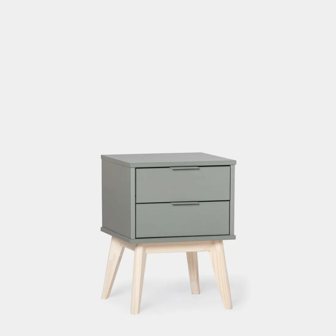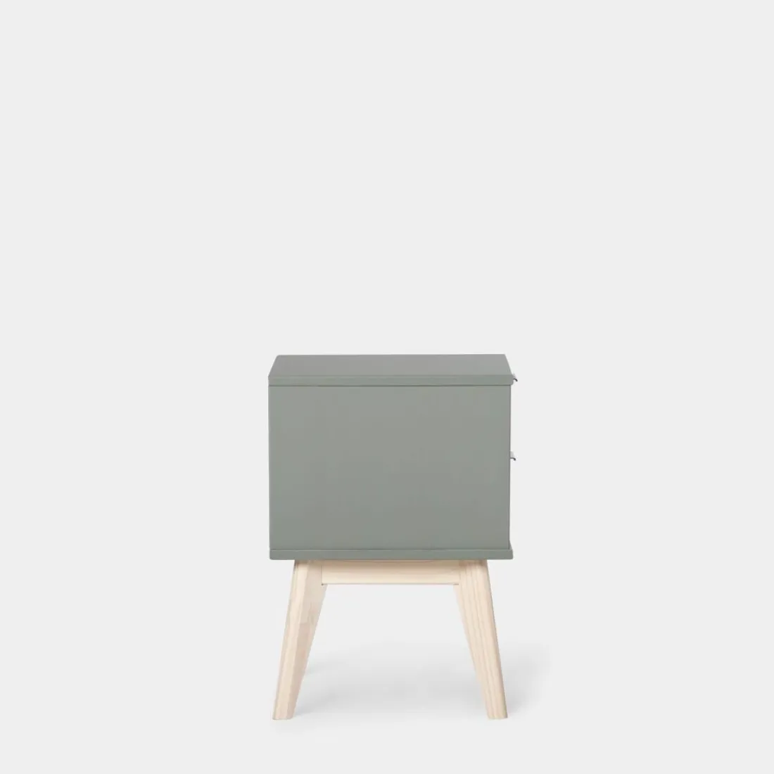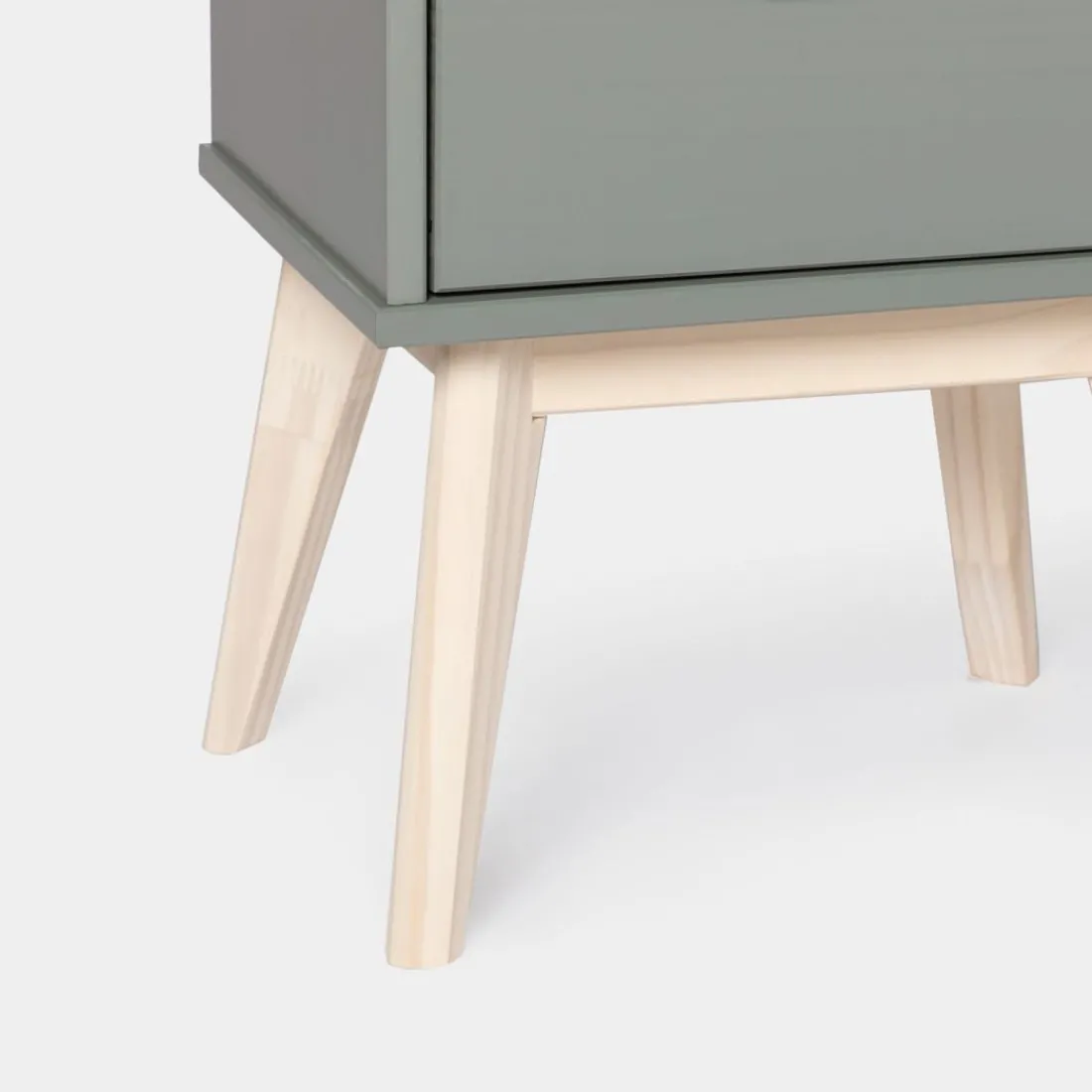 La mesita de noche Troy lacada en verde antracita con patas en madera maciza es perfecta para conseguir almacenaje extra y mantener tu dormitorio limpio y ordenado. Gracias a su diseño sencillo y atemporal puede encajar con cualquier estilo decorativo. También está disponible en blanco, escoge el acabado que más te guste.