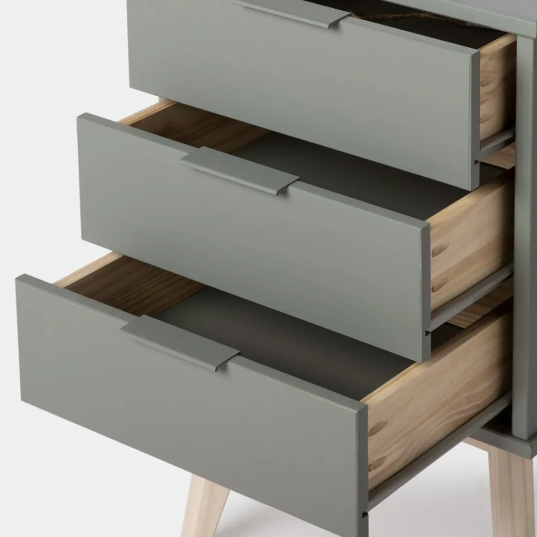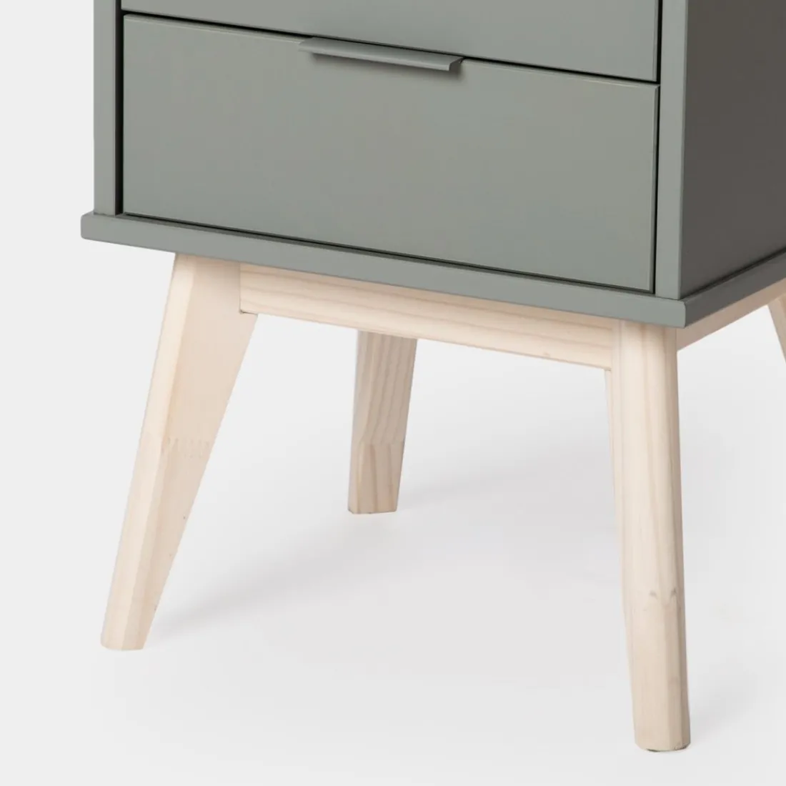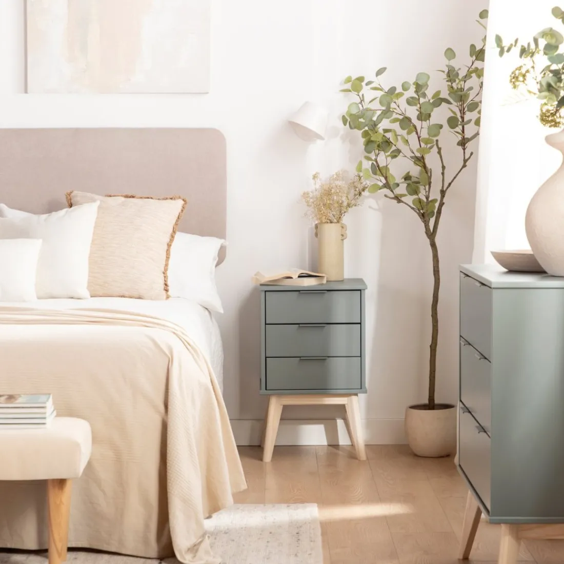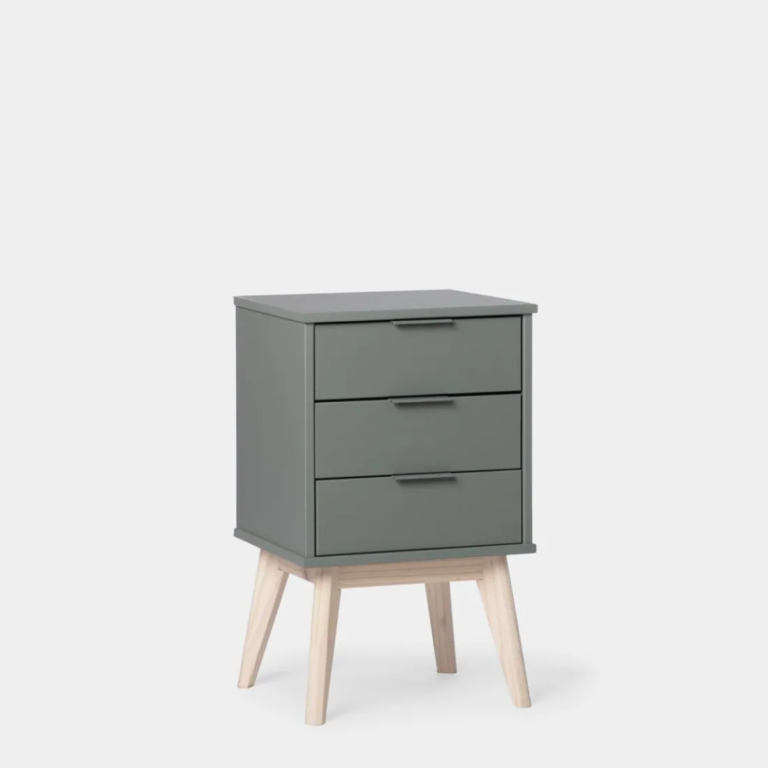 La mesita de noche lacada en verde antracita Troy de 3 cajones y patas en madera de pino natural es perfecta para conseguir almacenaje extra y mantener tu dormitorio limpio y ordenado. Gracias a su diseño sencillo y atemporal encaja en cualquier estilo decorativo.