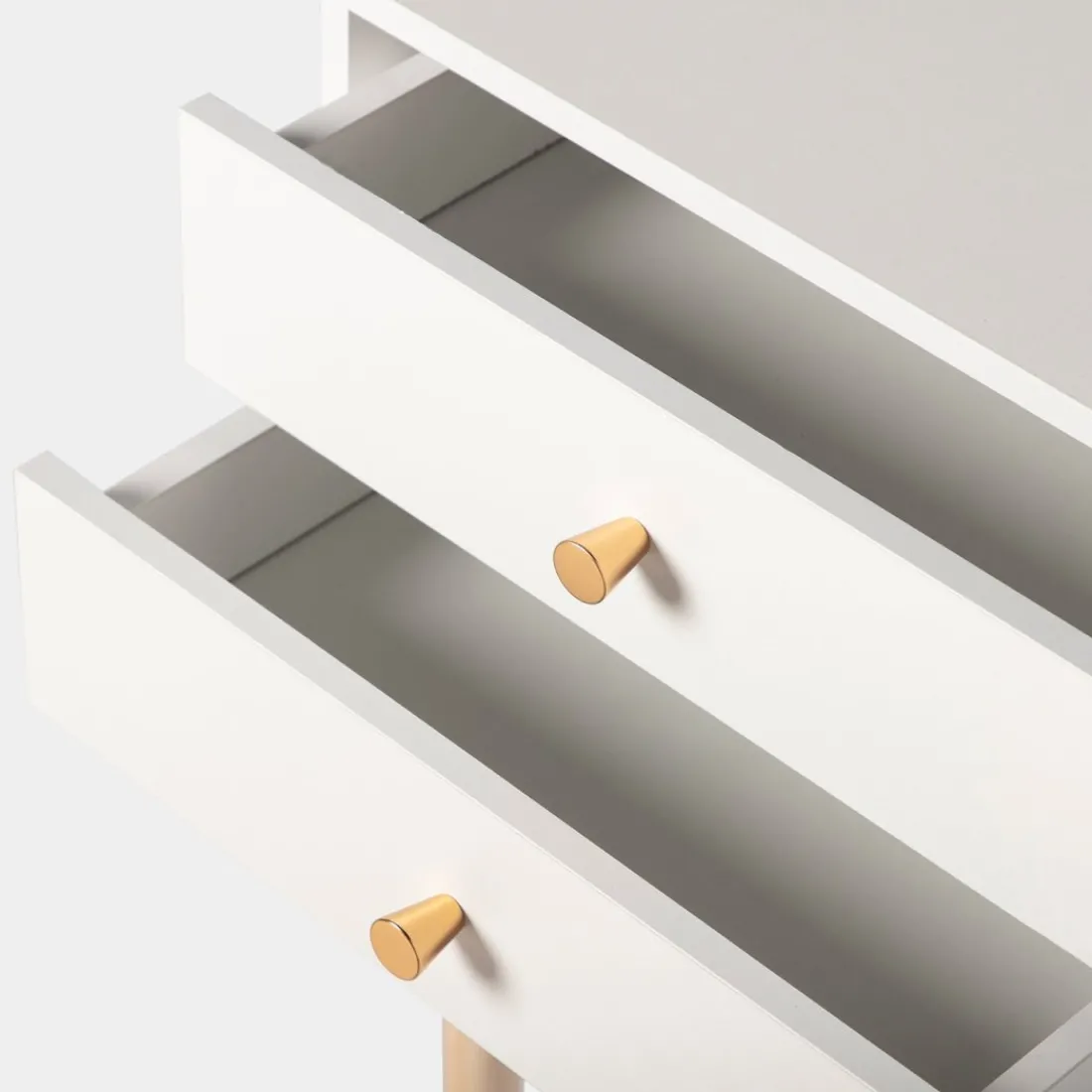 Completa la decoración de tu dormitorio con la mesita de noche blanca de dos cajones Vichy. Gracias a su diseño sencillo y atemporal podrás combinarla fácilmente con cualquier estilo decorativo. Cuenta con un práctico cajón en el que podrás almacenar y organizar diferentes objetos.