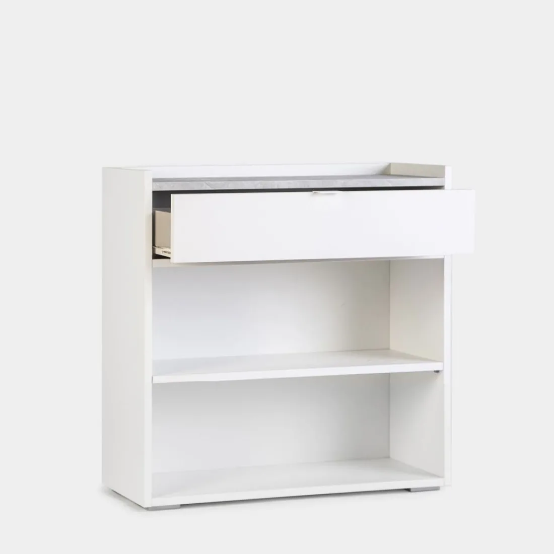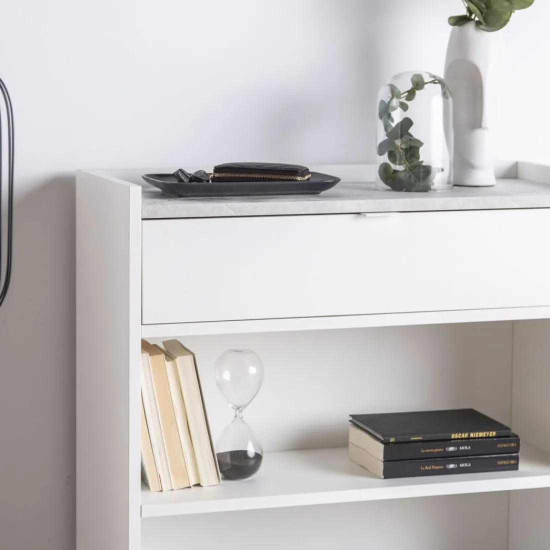 La consola Siena, es la elegancia en estado puro.Es una pieza de diseño propio creada por el equipo de Klast Home.De estilo nórdico este mueble recibidor dispone de un cajón superior dónde guardar aquello que desees, como las llaves o la correspondencia.Además dispone de una balda ideal para poder almacenar tus accesorios o libros. Tiene mucha capacidad.Cuando hablamos de Siena, hablamos de diseño en mayúsculas, una de sus características más destacables, es su sobre con efecto marmolado, sin duda un detalle que derrocha estilo. Visita el resto de la colección y completa el look.Para mayor estabilidad del mueble, aconsejamos su anclaje a pared.