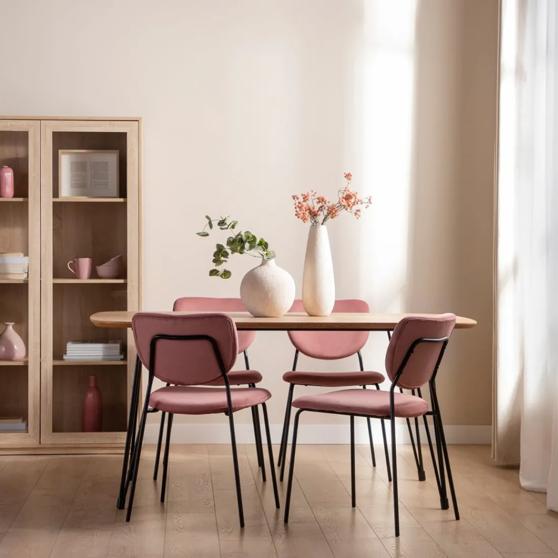 ¡Aprovéchate de este pack! La silla de comedor Taylor en terciopelo rosa es la apuesta perfecta para los amantes del diseño atemporal. Sus patas metálicas en color negro, le aportan además un carácter sofisticado y una polivalencia que le permite ser también una buena alternativa como silla de escritorio. Combínalo a tu gusto con alguno de los 3 acabados disponibles.