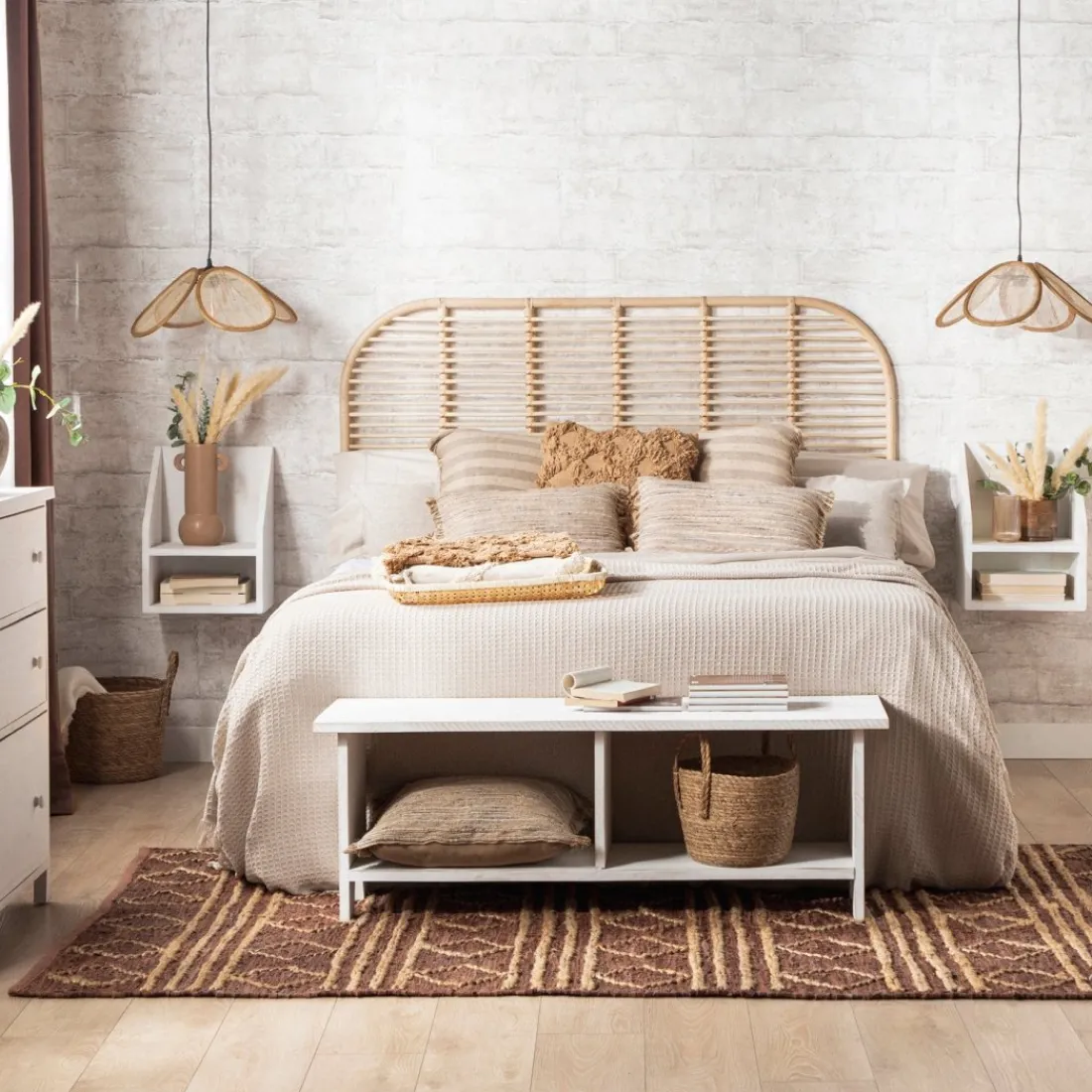 ¡Aprovéchate de este pack! La mesita de noche flotante Folk, fabricada en madera reciclada libre de tratamientos químicos, fusiona la belleza del estilo natural con la sostenibilidad del upcycling. Cada pieza, elaborada artesanalmente, cuenta una historia única a través de sus imperfecciones y aporta carácter al dormitorio. Requiere anclaje a pared.