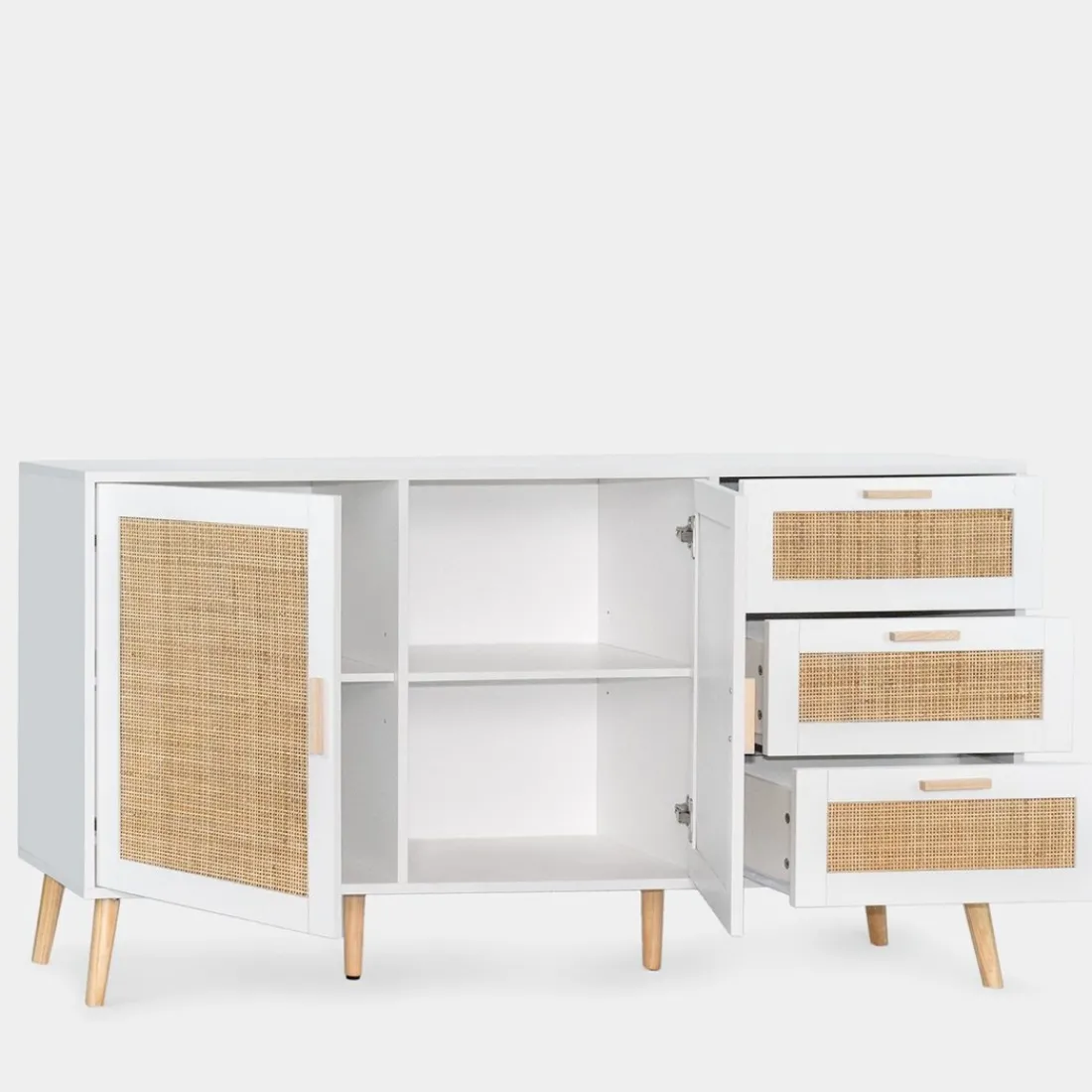 Consigue un plus de almacenamiento y estilo con el aparador en ratán natural Tahiti. Cuenta con dos puertas y tres cajones que permiten optimizar al máximo el espacio y mantener el orden. Para mayor estabilidad del mueble, aconsejamos su anclaje a la pared. Combínalo con otras piezas de la colección y ¡consigue un efecto wow!