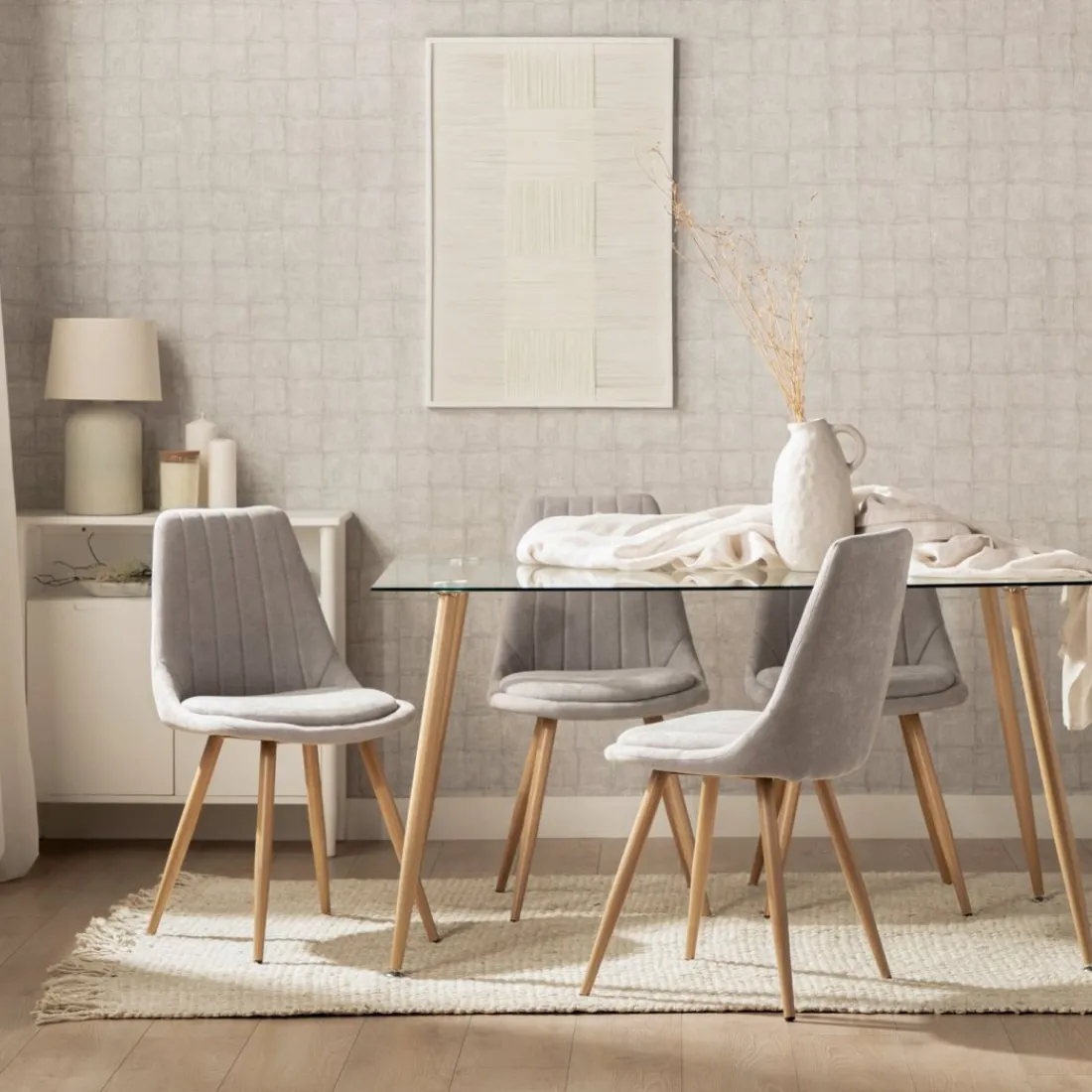 La silla de comedor tapizada Ingrid es una perfecta opción para tu salón o comedor. Con respaldo en poliéster efecto rayado y cojín inferior, esta preciosa silla con patas de metal efecto madera destaca por su cómoda sentada y su diseño de líneas sencillas. Elige uno de los 4 colores disponibles en nuestra web y dale un toque elegante a tu salón.