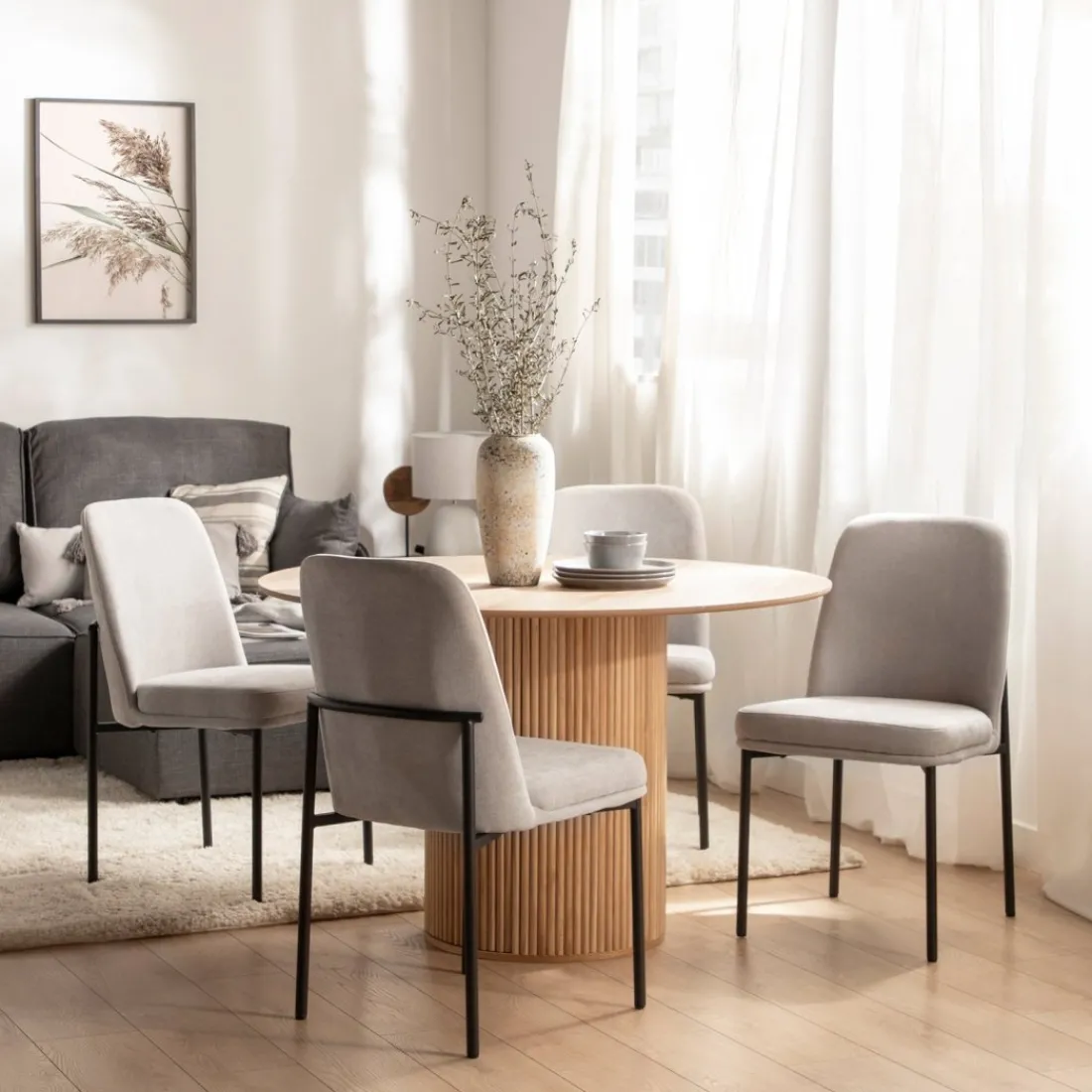 Eleva el estilo de tu comedor con la silla de comedor Leila, tapizada en gris con elegantes patas metálicas negras. Su diseño ergonómico garantiza una experiencia de confort excepcional, ya sea durante largas comidas familiares o en largas sesiones de trabajo en casa. Esta versátil silla se adapta sin esfuerzo a cualquier espacio, ya sea como parte de tu comedor o como una distinguida silla de escritorio. Escoge el tapizado que más te guste y combinala sin esfuerzo con una amplia gama de estilos decorativos.
