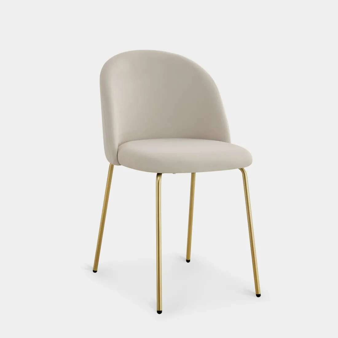 La silla de comedor Olivia tapizada en terciopelo beige con pata dorada tiene un diseño elegante y sencillo inspirado en los años 50. Su respaldo corto y redondeado unido al diseño de sus patas cónicas despuntadas recuerdan a esos modelos de sillería sofisticados y funcionales adaptables a cualquier estilo.
