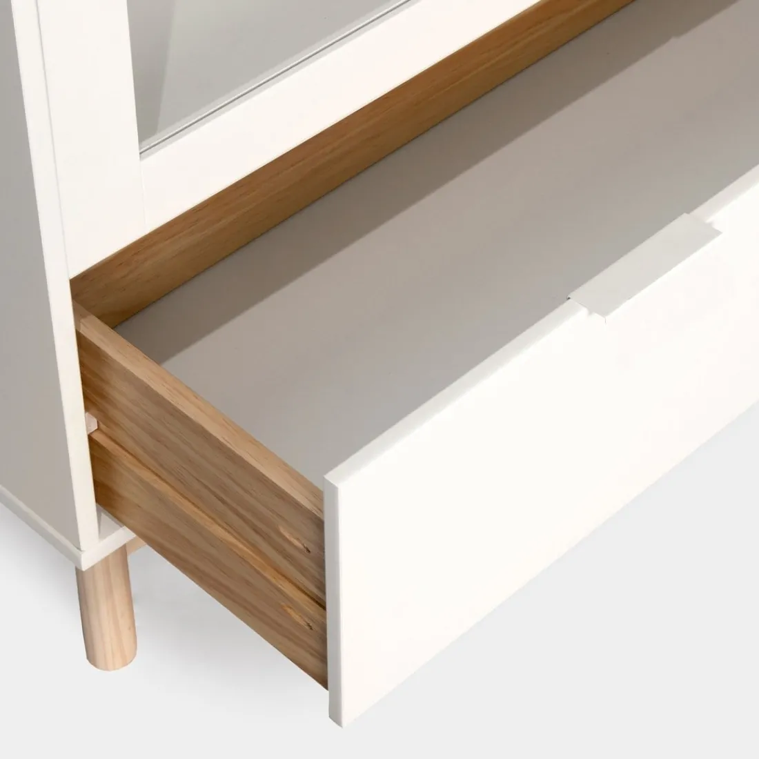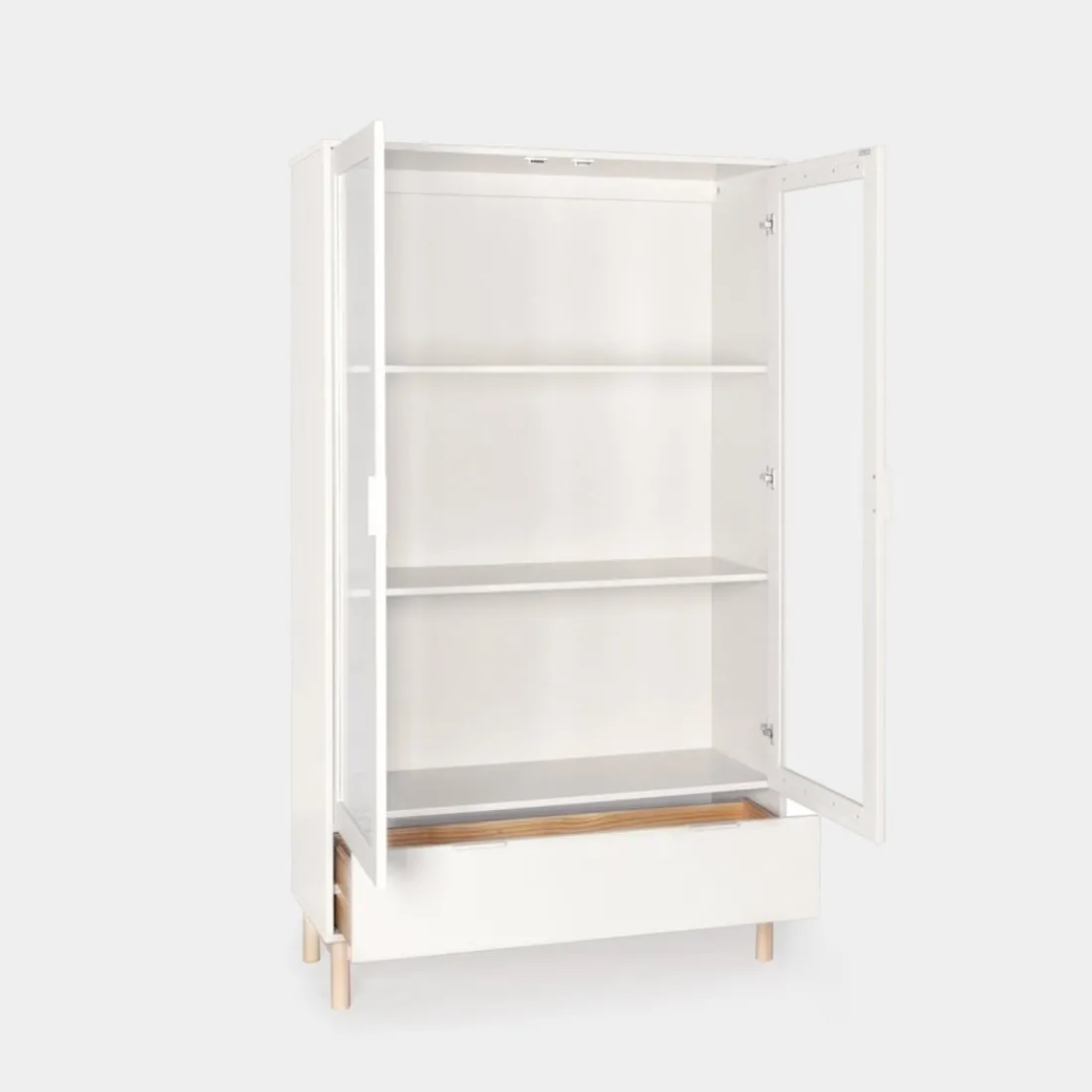 Completa la decoración de tu salón con la vitrina lacada en color blanco Elian. Sus dos puertas acristaladas permiten exhibir y almacenar tu menaje del hogar mientras los protegen del polvo. Además, su cajón inferior proporciona un espacio adicional perfecto para guardar mantelería u otros textiles del hogar. Combínala con otros muebles de la colección y consigue un espacio armonioso y acogedor.