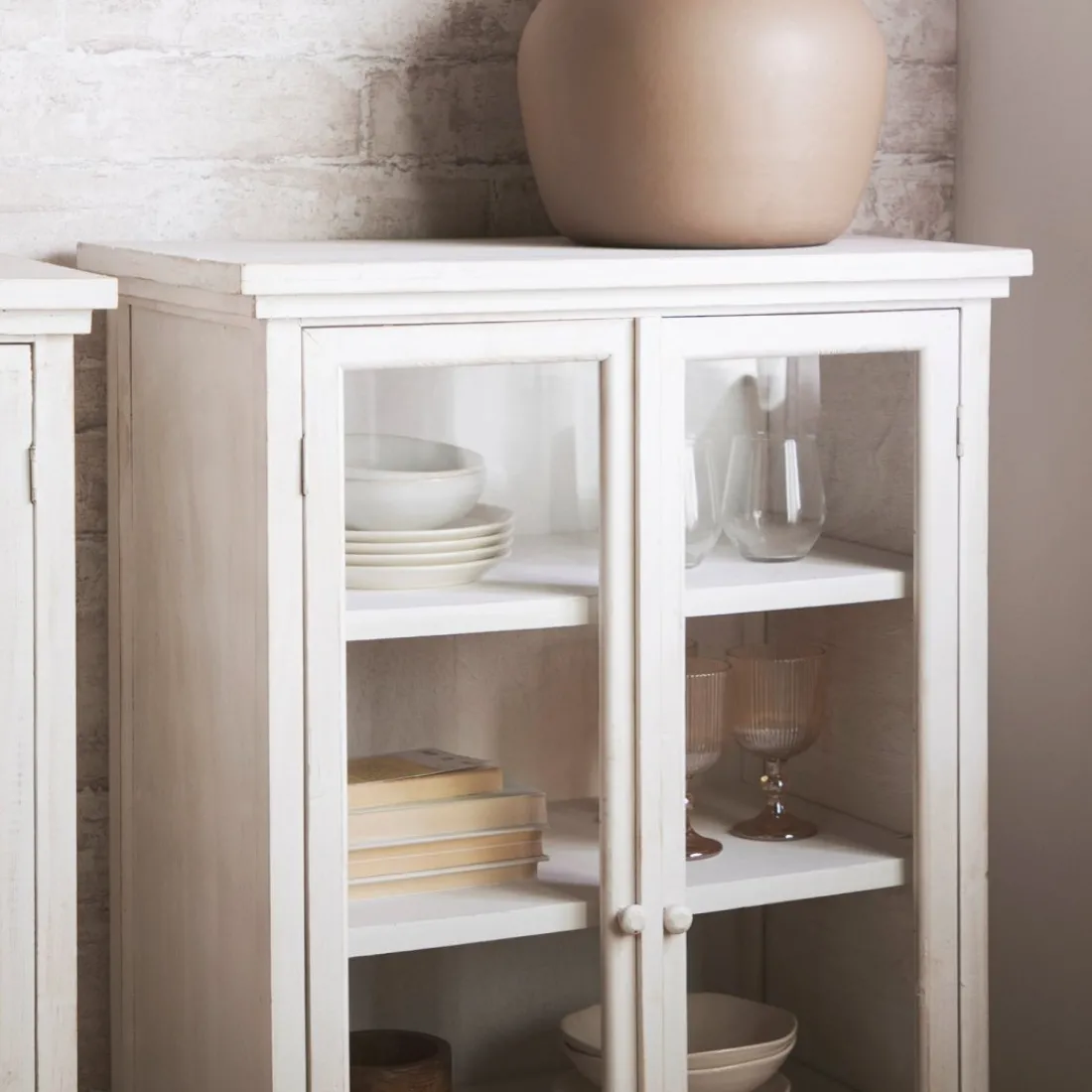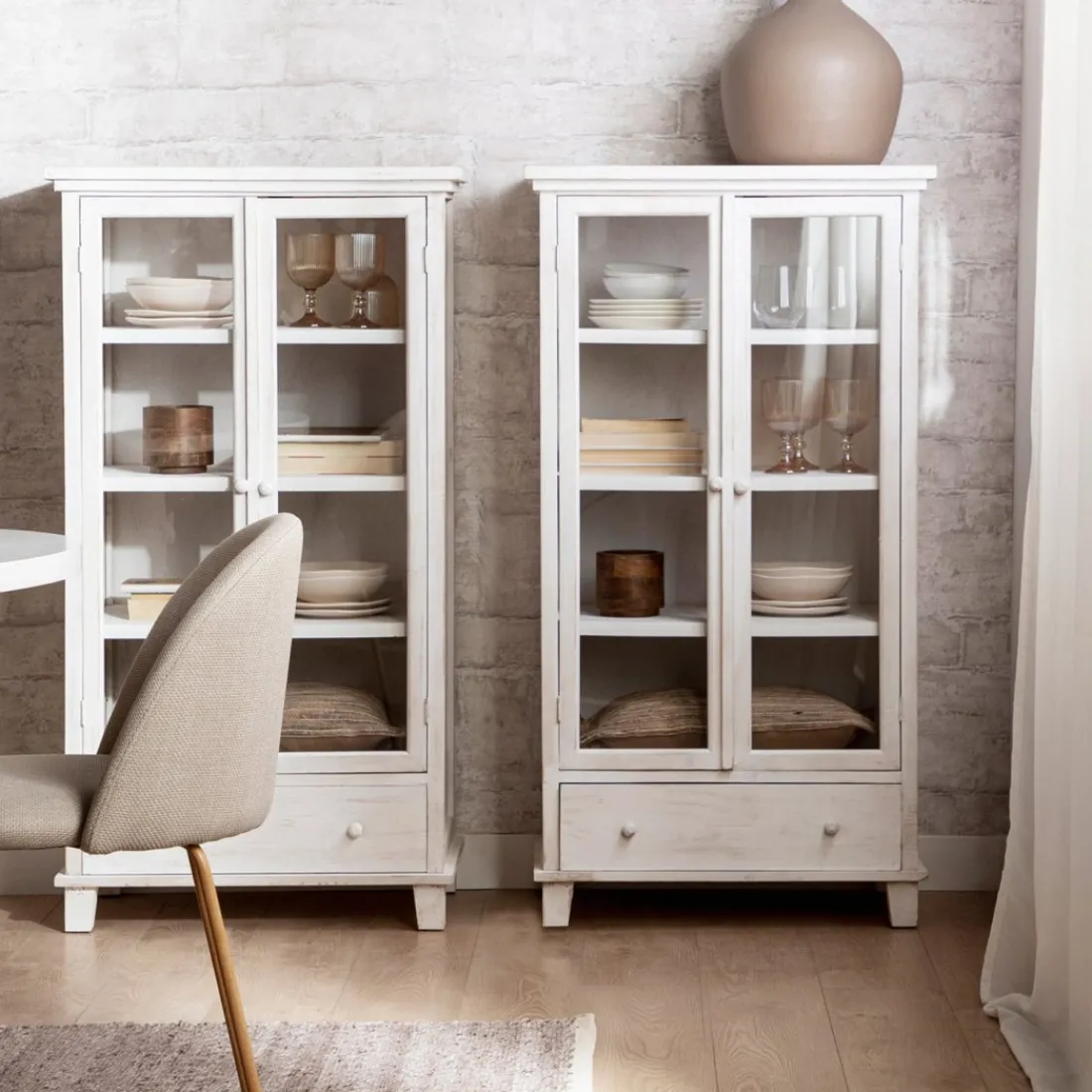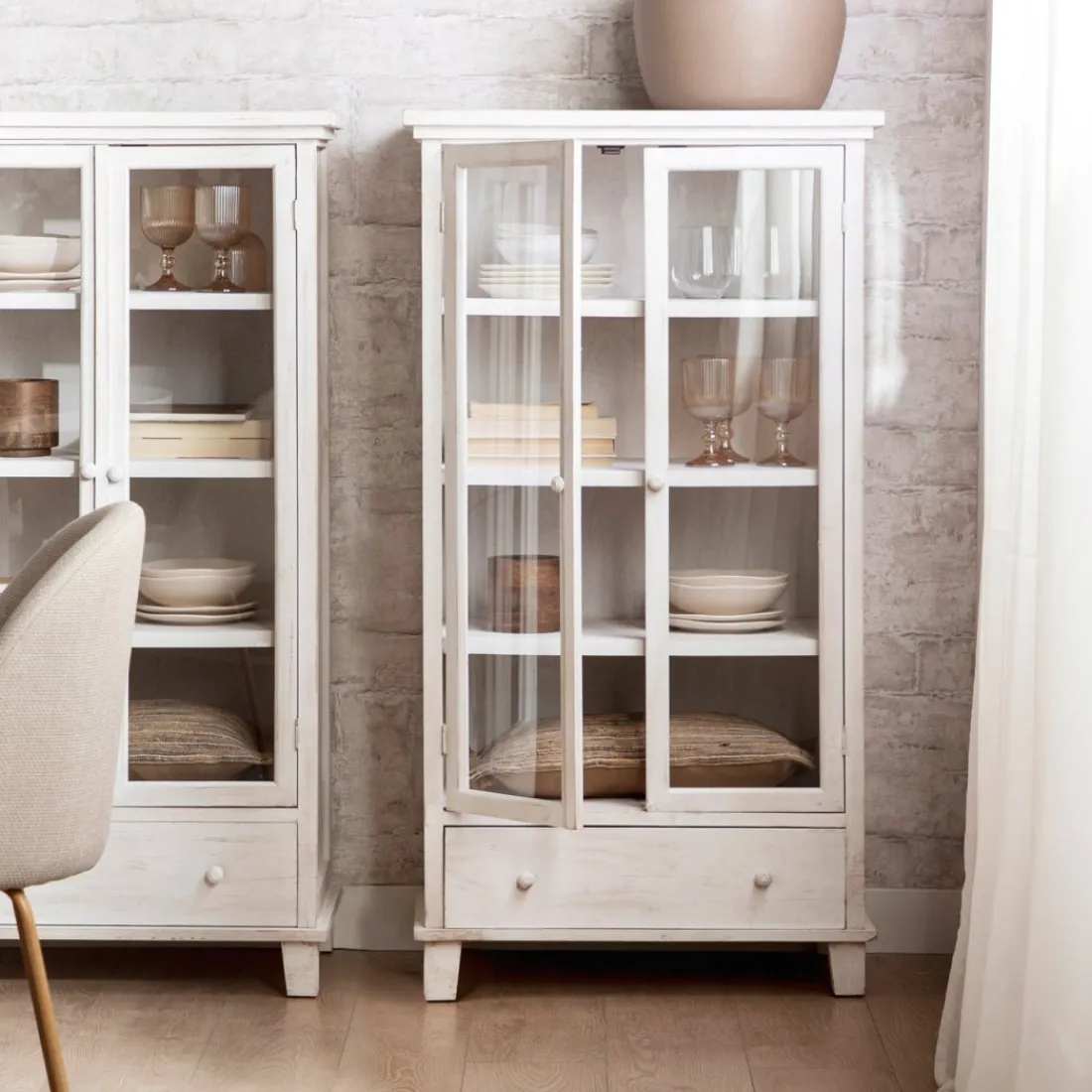 La vitrina Folk, fabricada en madera reciclada libre de tratamientos químicos, combina la belleza del estilo natural con la sostenibilidad del upcycling. Cada pieza, elaborada artesanalmente, cuenta una historia única a través de sus imperfecciones y aporta carácter a cualquier estancia. Cuenta con dos puertas acristaladas perfectas para exhibir la vajilla y con un amplio cajón destinado al almacenamiento de mantelería. El sistema de cierre de cajón es sin guia. Para mayor estabilidad del mueble, aconsejamos su anclaje a la pared.