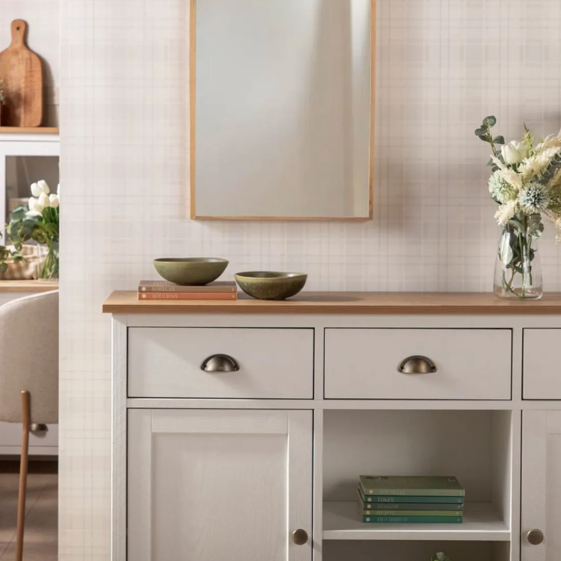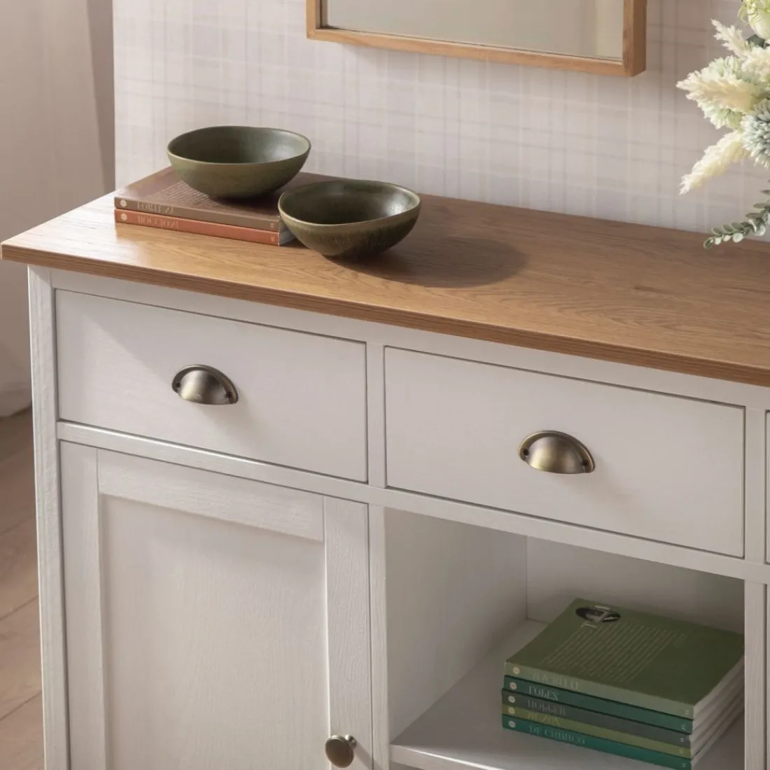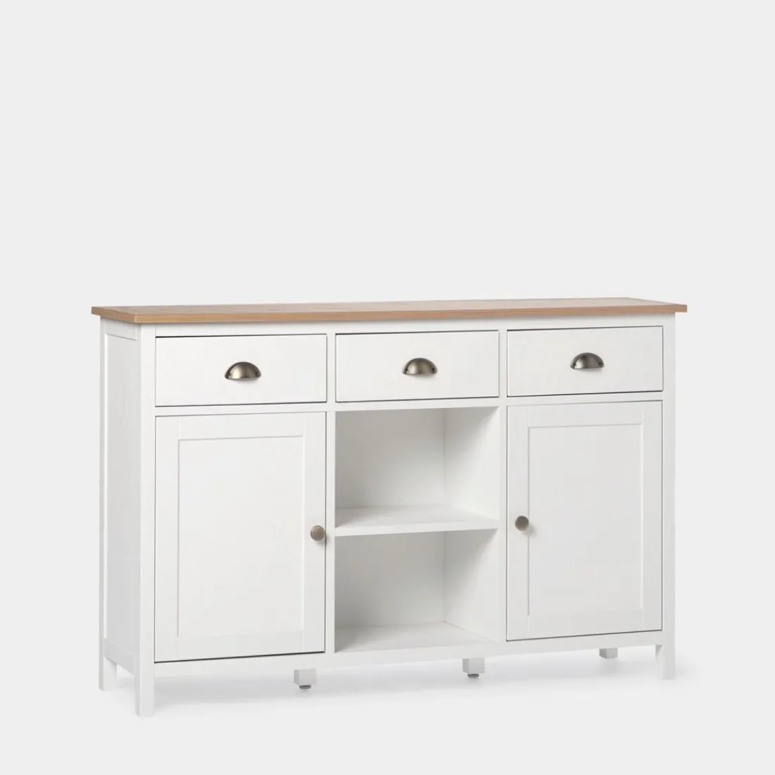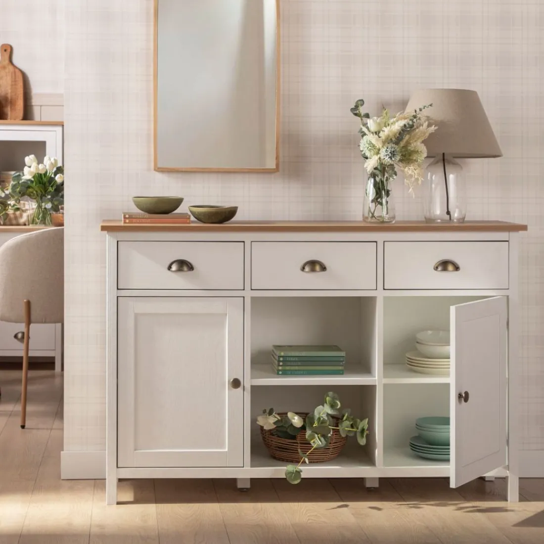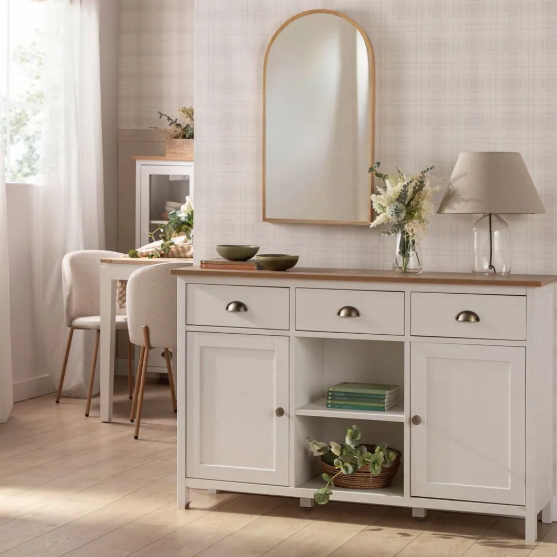 Con el aparador estrecho blanco Marais conseguirás el espacio de almacenamiento adicional que estás buscando para tu hogar. Gracias a su gran capacidad de almacenaje podrás guardar todo el menaje del hogar y mantener el orden en casa. Sus tres cajones cuentan con un sistema de cierre con retención que evita que se den golpes al cerrar e impide la apertura involuntaria. Para mayor estabilidad del mueble, aconsejamos su anclaje a la pared.