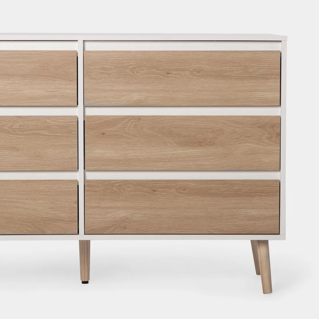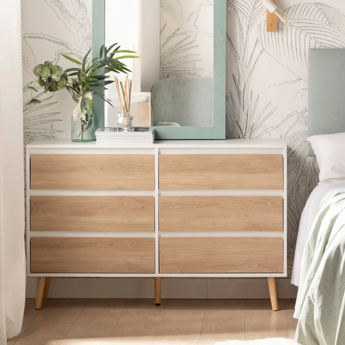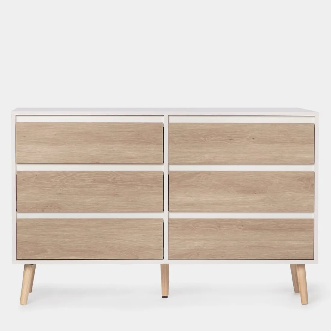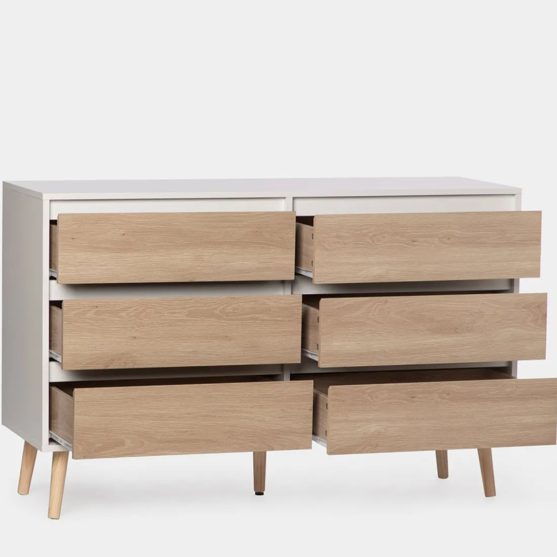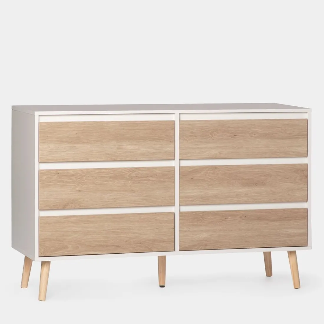 Con la cómoda de 6 cajones en madera color blanco y natural Kemi conseguirás crear un ambiente fresco y luminoso. Su diseño nórdico y sencillo convierte a esta cómoda en una apuesta segura para completar la decoración de tu dormitorio. Además, cuenta con 6 amplios cajones en los que podrás almacenar y organizar todas tus pertenencias.