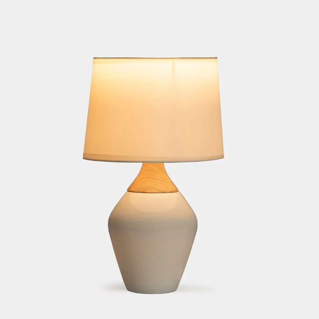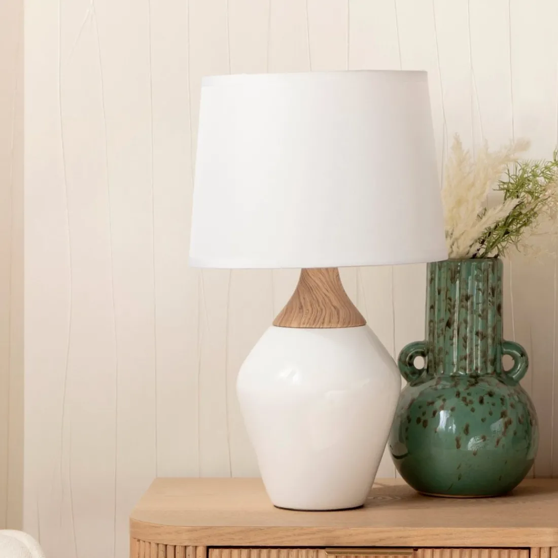 La lámpara de mesa Zasa, elaborada en gres blanco, un material noble y artesanal, infunde delicadeza y naturalidad en cualquier espacio. Su pantalla de poliéster blanca, combinada con el gres blanco, ofrece una estética que aporta serenidad a tu dormitorio, salón o recibidor. No incluye bombilla.