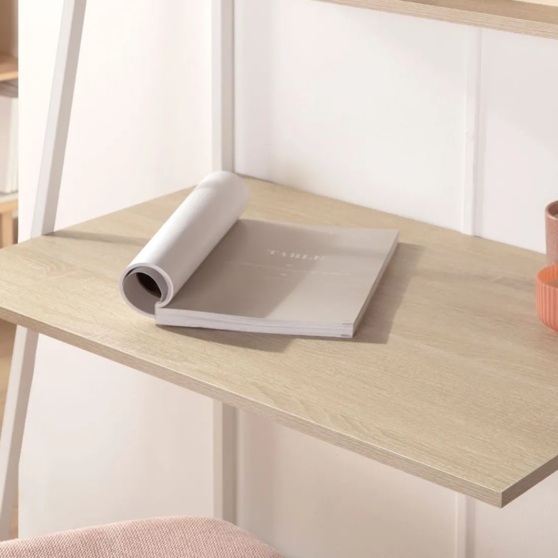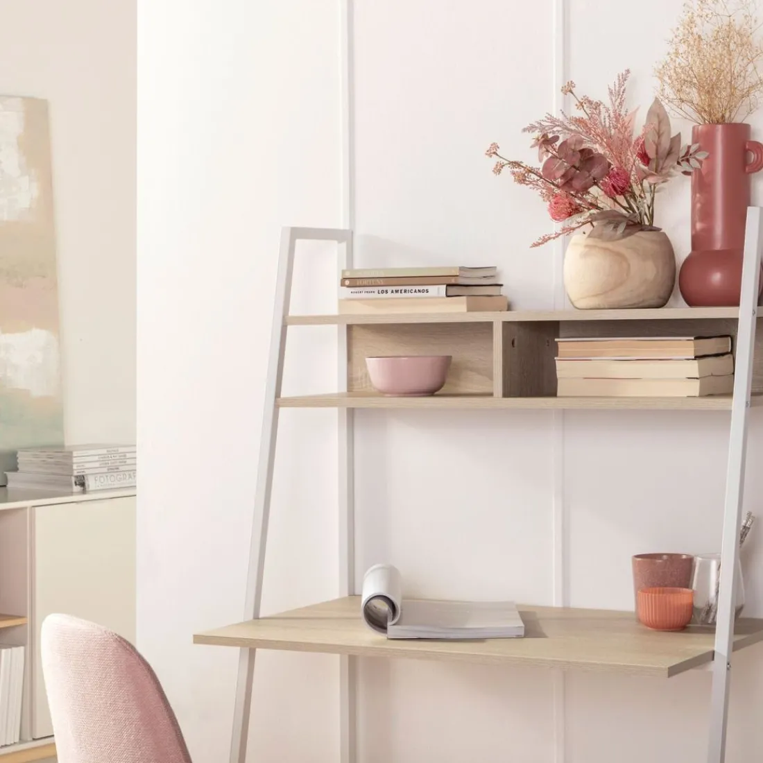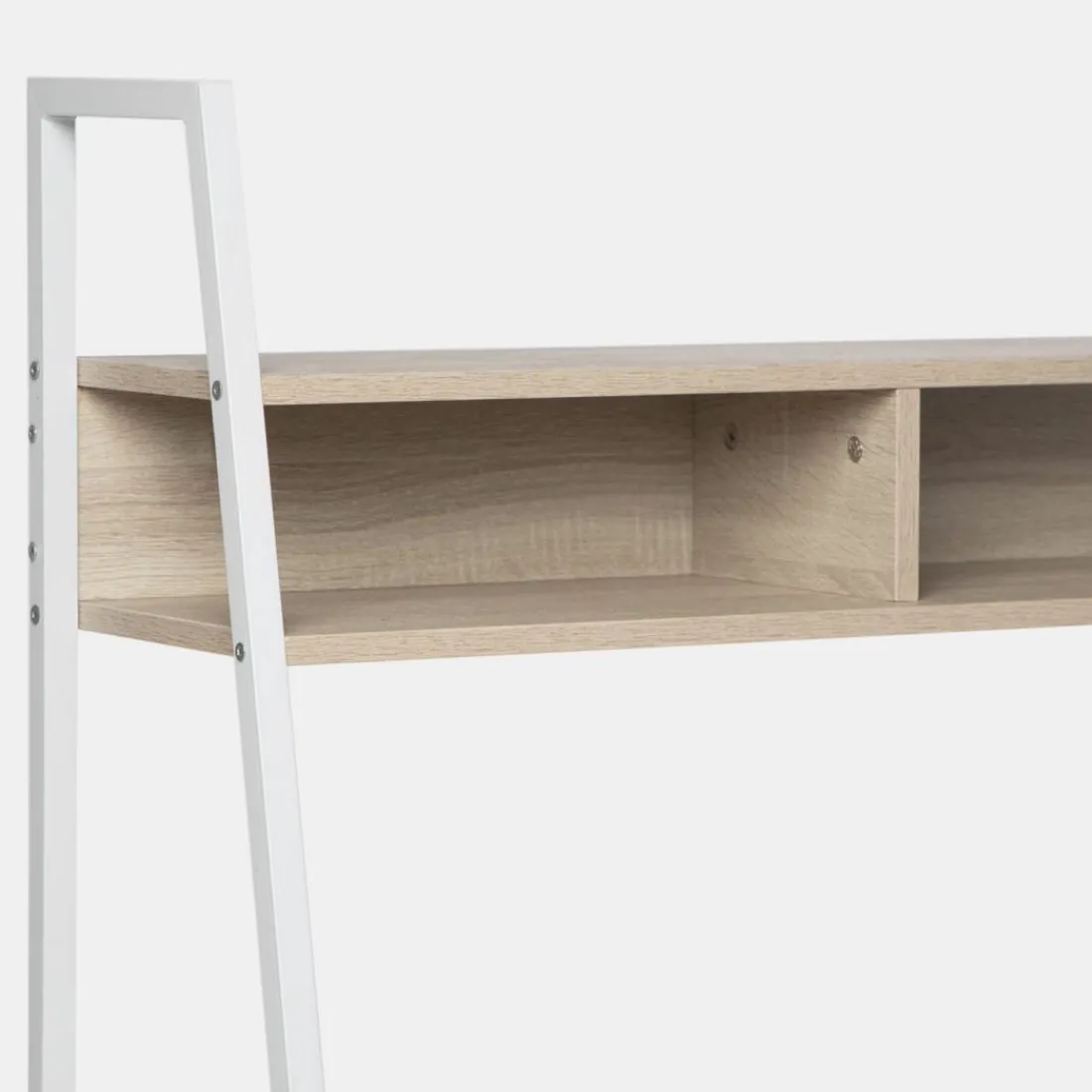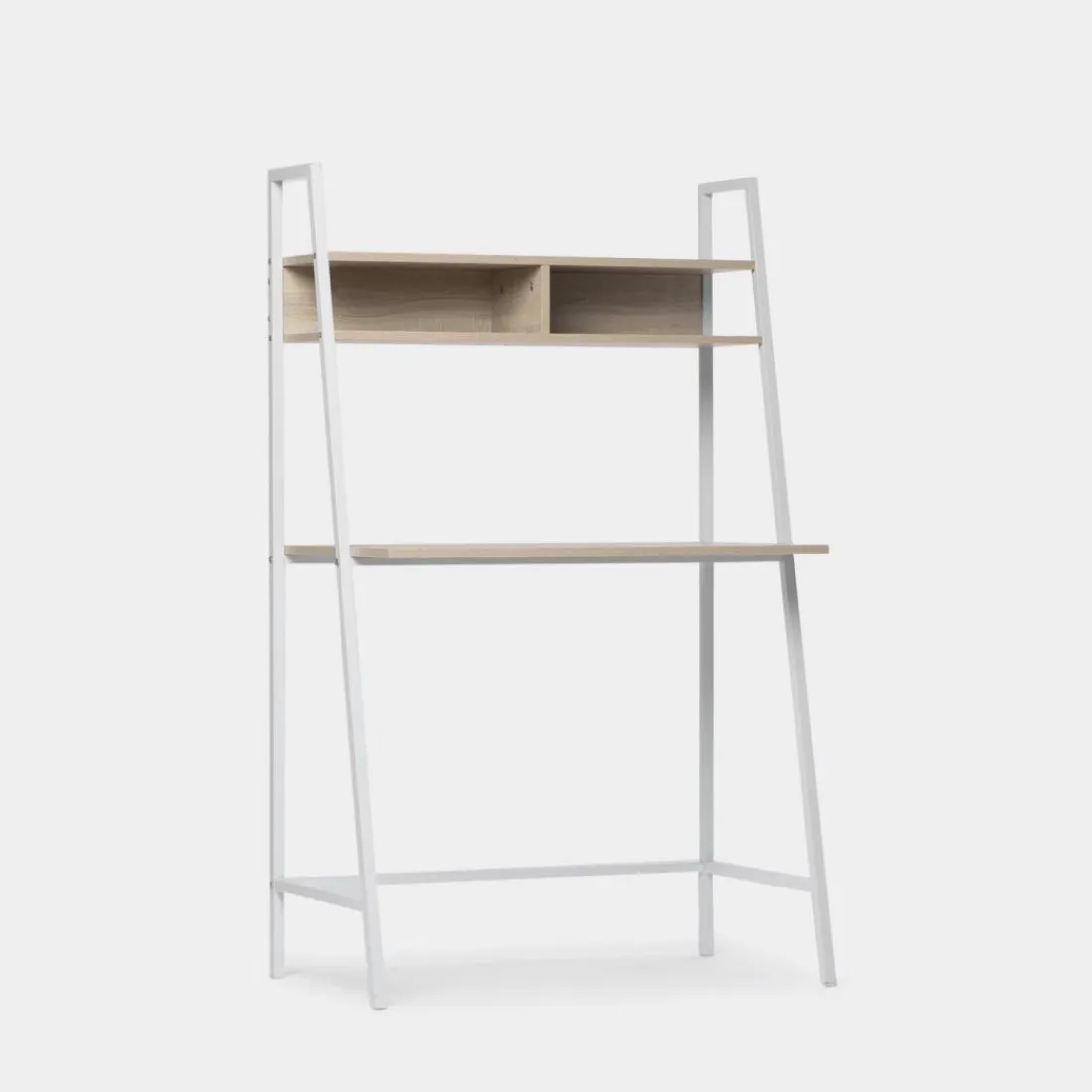 Apuesta por el escritorio Clerk en acabado natural y estructura blanca. Su estante superior lo hace muy funcional y estético. Te permite almacenar de una forma ordenada aquello que necesites o incluso poner accesorios decorativos para darle el toque deco que necesitas. Con inspiración industrial esta mesa de estudio y/o trabajo será la pieza que necesitas en tu oficina o dormitorio.