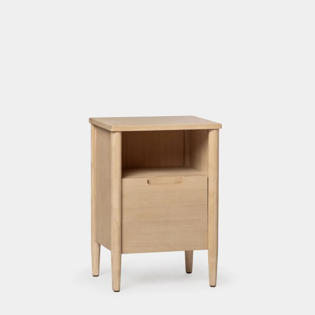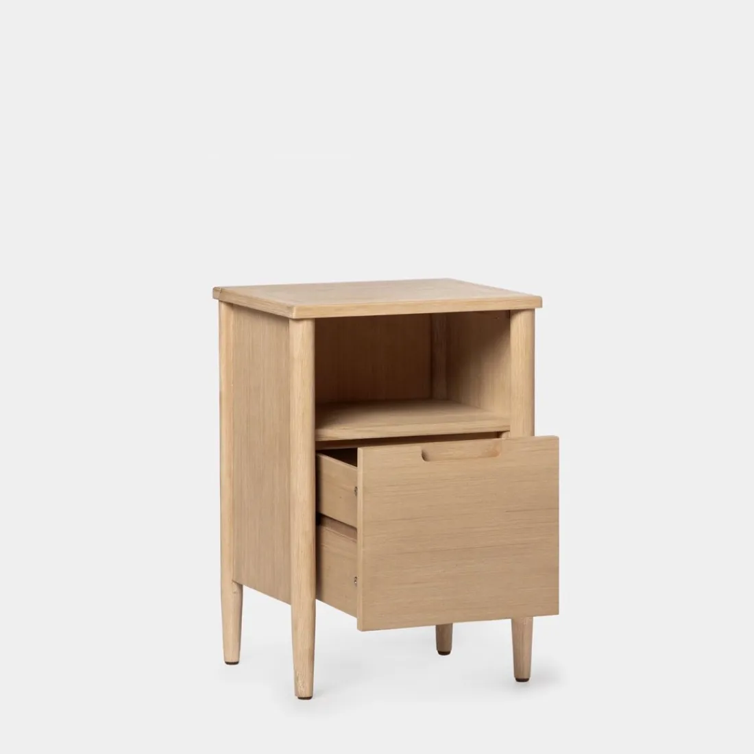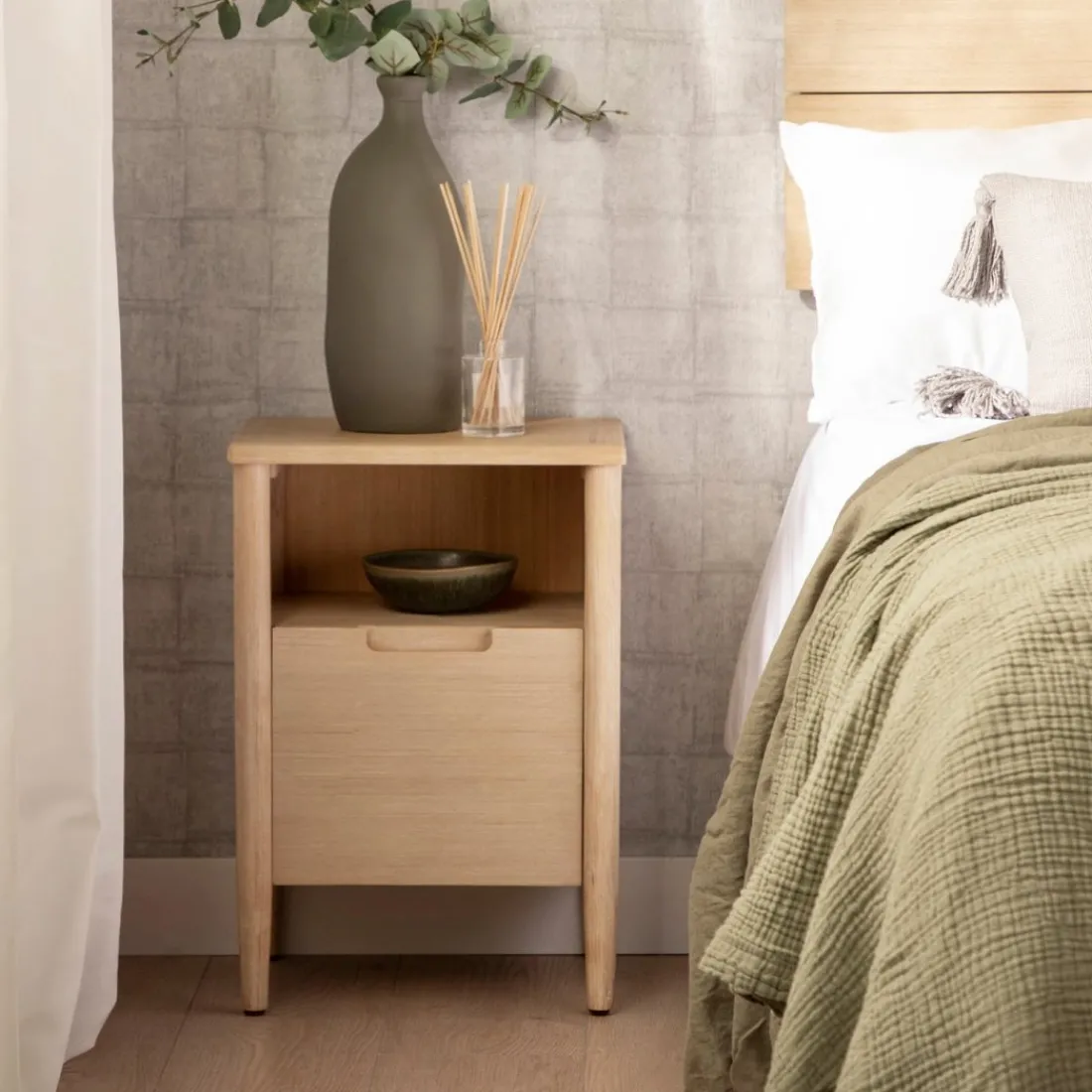 La mesita de noche en chapa de pino y madera de abedul Kenan es una pieza atemporal y funcional perfecta para el dormitorio. Cuenta con un amplio cajón y un hueco en el que podrás guardar tus objetos personales y mantenerlos al alcance de tu mano durante la noche. Su diseño sencillo y atemporal encaja en cualquier estilo decorativo. Disponible en varios acabados, escoge el que más te guste.