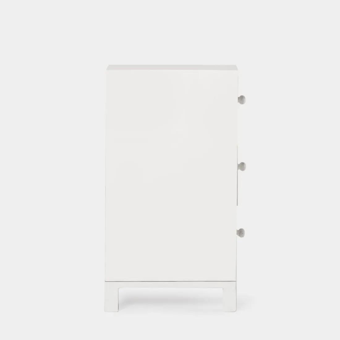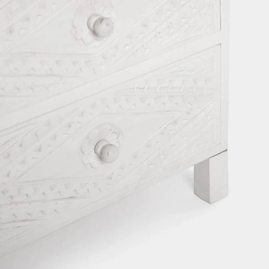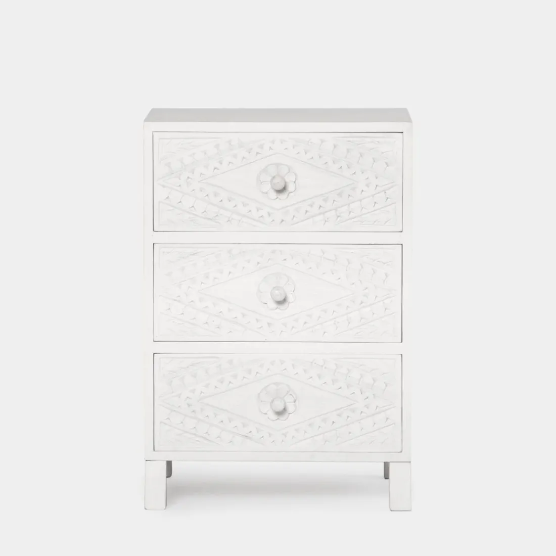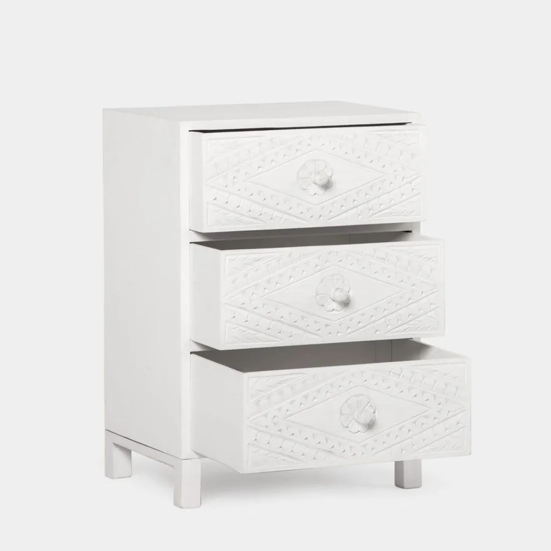 La mesita de noche de 3 cajones en blanco vintage Sinta es el mueble auxiliar ideal para completar la decoración de tu dormitorio. Sus 3 amplios cajones darán un extra de almacenamiento a tu hogar. Ha sido fabricada a mano por maestros artesanos, por lo que cada pieza es única.