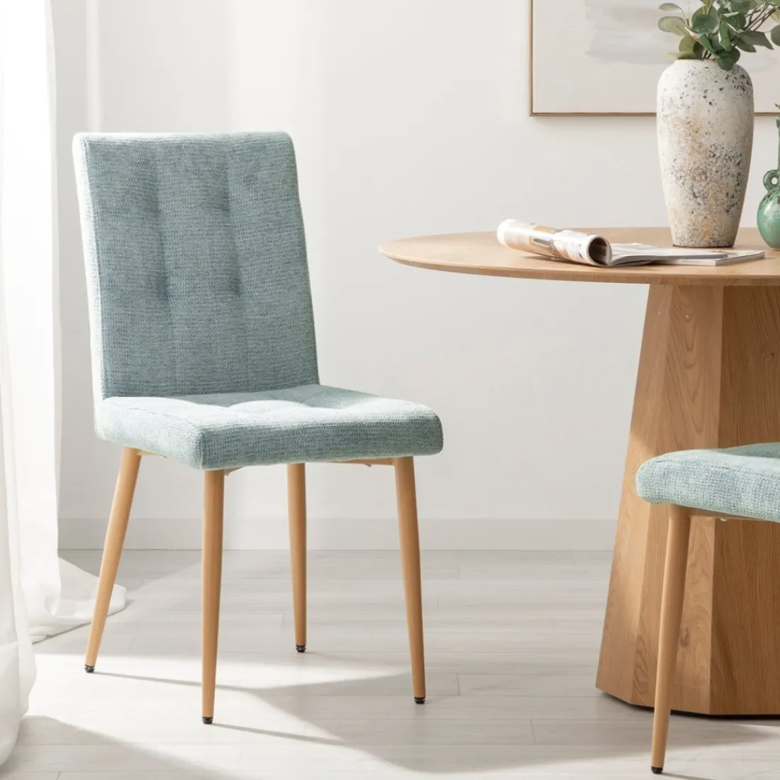 La silla de comedor tapizada Leia en menta con pata metálica efecto madera es ideal para quienes buscan combinar estilo, confort y sofisticación en su comedor. Con su diseño elegante y el detalle de capitoné en el respaldo, la silla Leia será un complemento perfecto para reuniones familiares y cenas formales. Disponible en varios acabados, escoge el que mejor encaje con tu estilo.