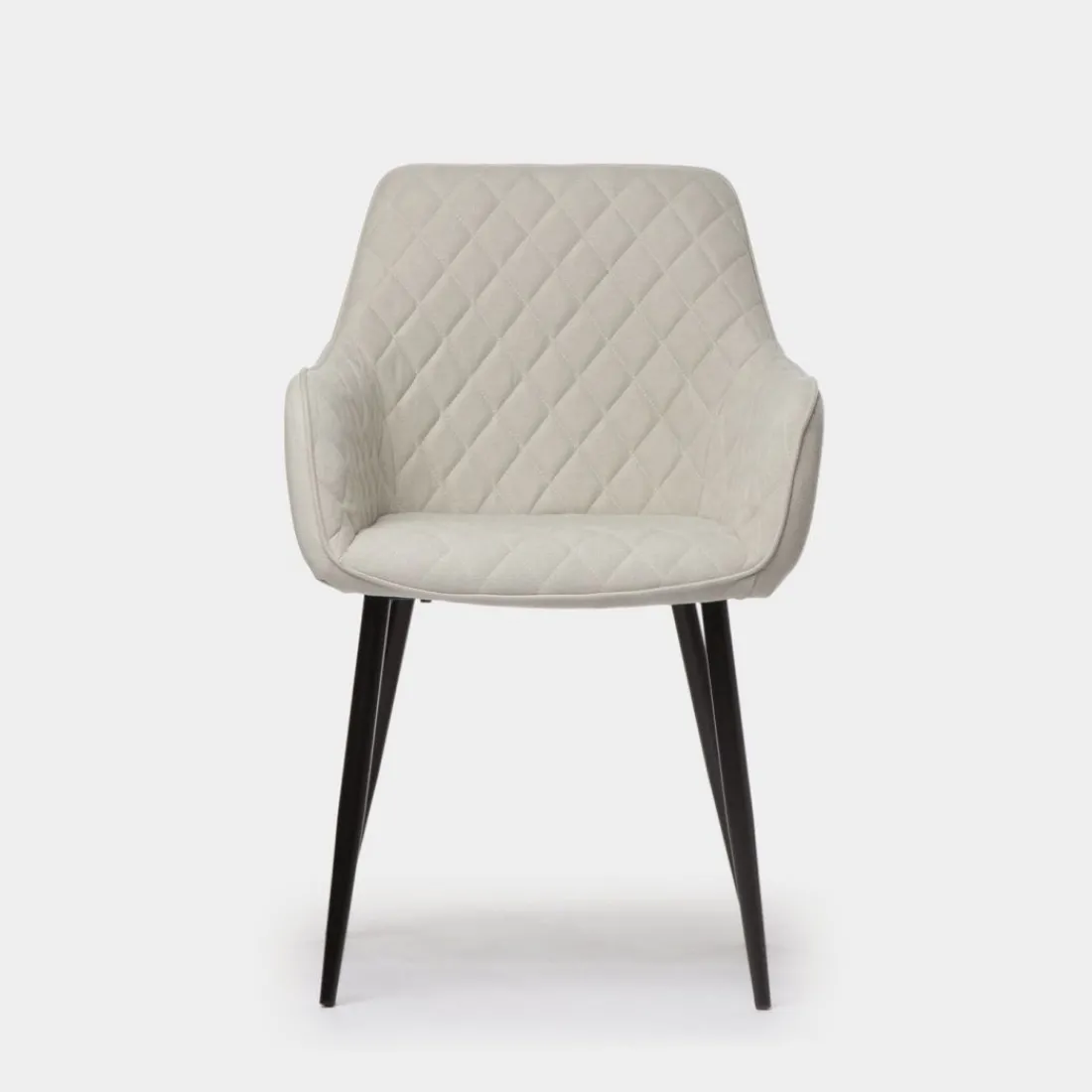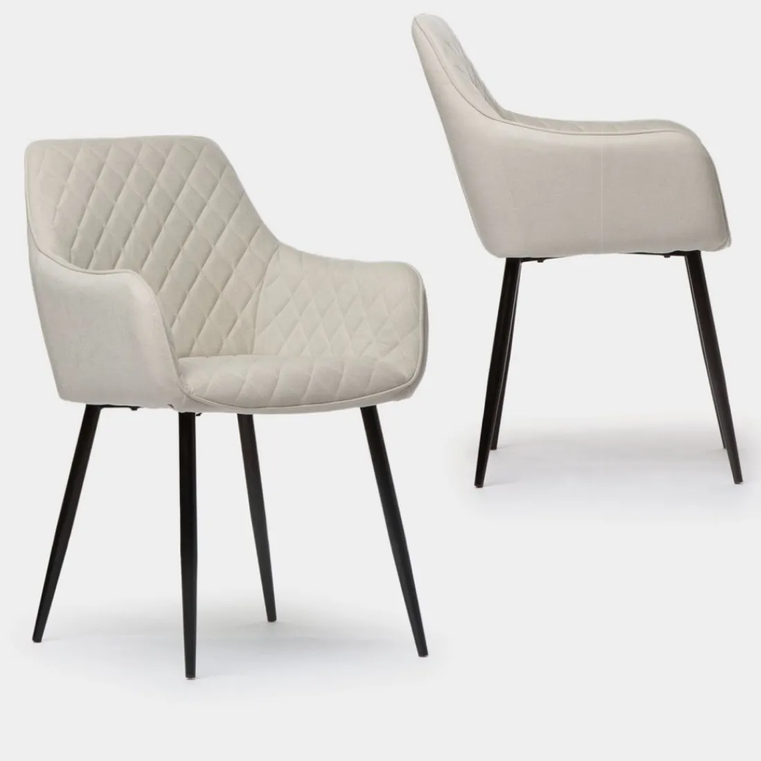¡Aprovéchate de este pack de sillas! Las silla de comedor tapizada Lizel con pata metálica negra es una apuesta por el confort gracias a su forma ergonómica con reposabrazos integrado. Su acabado en poliéster con dibujo en rombos está disponible en 2 colores, elige entre uno de ellos para darle un toque de modernidad y sofisticación a tu salón.