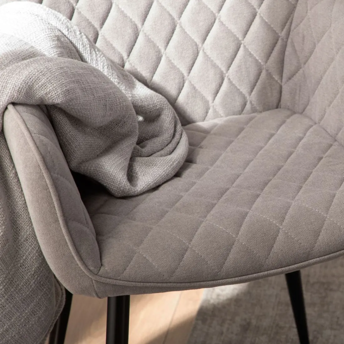 ¡Aprovéchate de este pack! Las silla de comedor tapizada Lizel con pata metálica negra es una apuesta por el confort gracias a su forma ergonómica con reposabrazos integrado. Su acabado en poliéster con dibujo en rombos está disponible en 2 colores, elige entre uno de ellos para darle un toque de modernidad y sofisticación a tu salón.