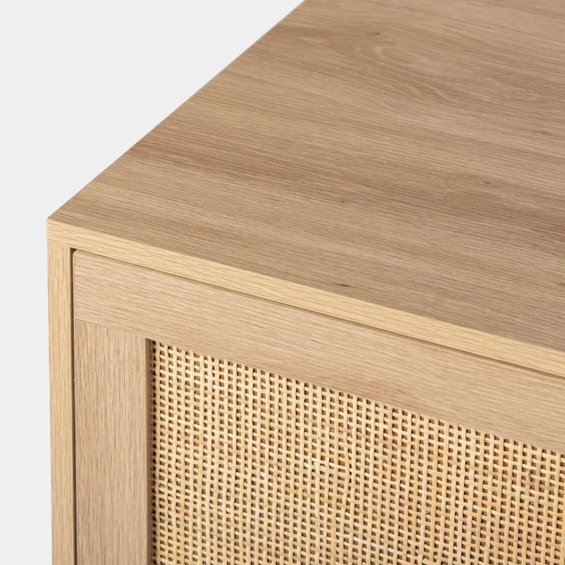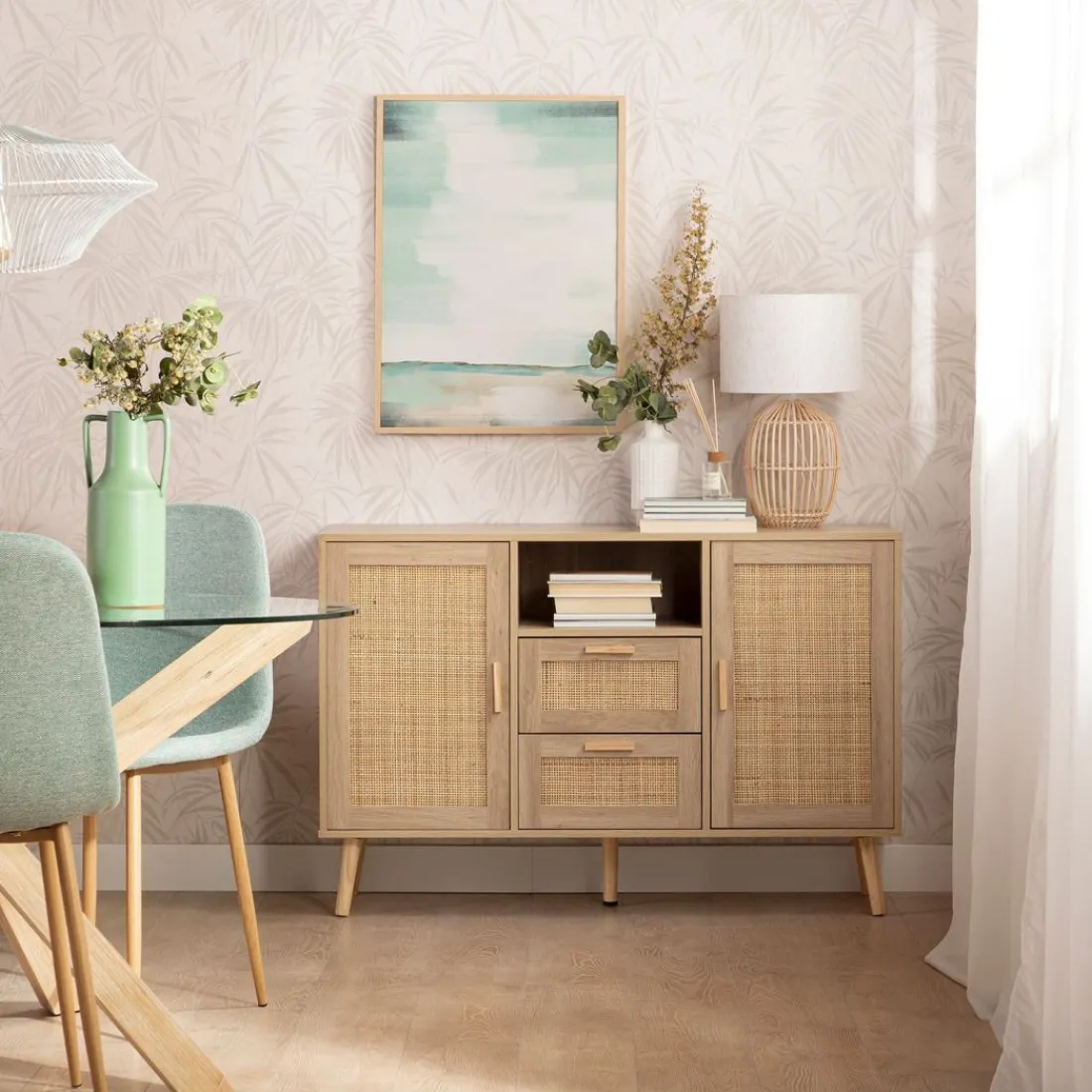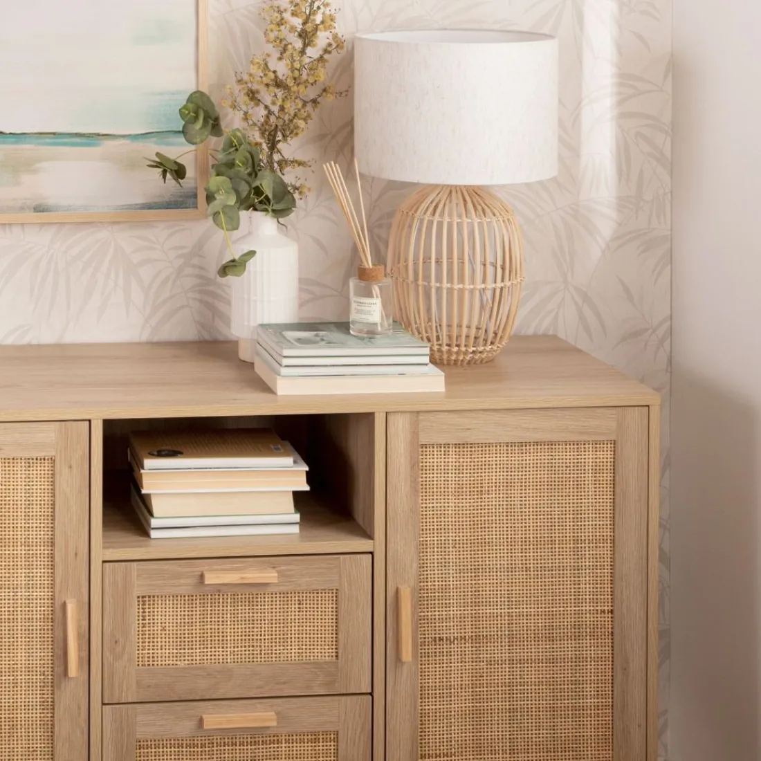 Consigue un plus de almacenamiento y estilo con el aparador en ratán natural Tahiti. Cuenta con dos puertas, dos cajones y un estante que permiten optimizar al máximo el espacio y mantener el orden en casa. Para mayor estabilidad del mueble, aconsejamos su anclaje a la pared. Combínalo con otras piezas de la colección y ¡consigue un efecto wow!