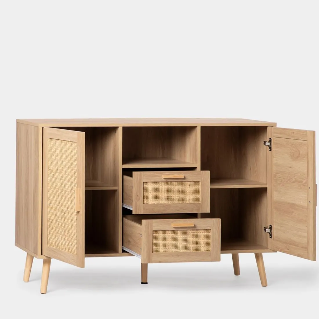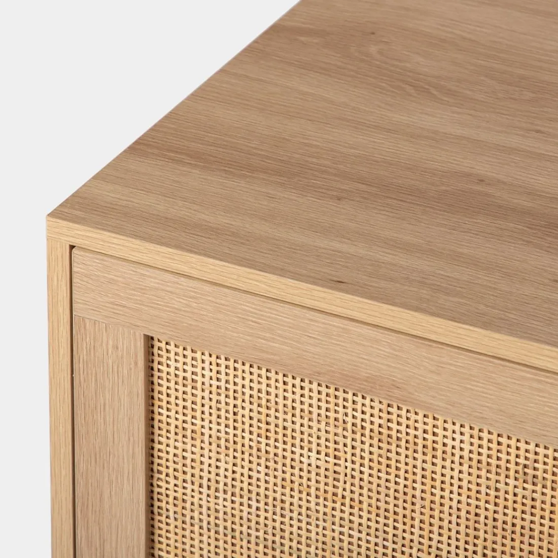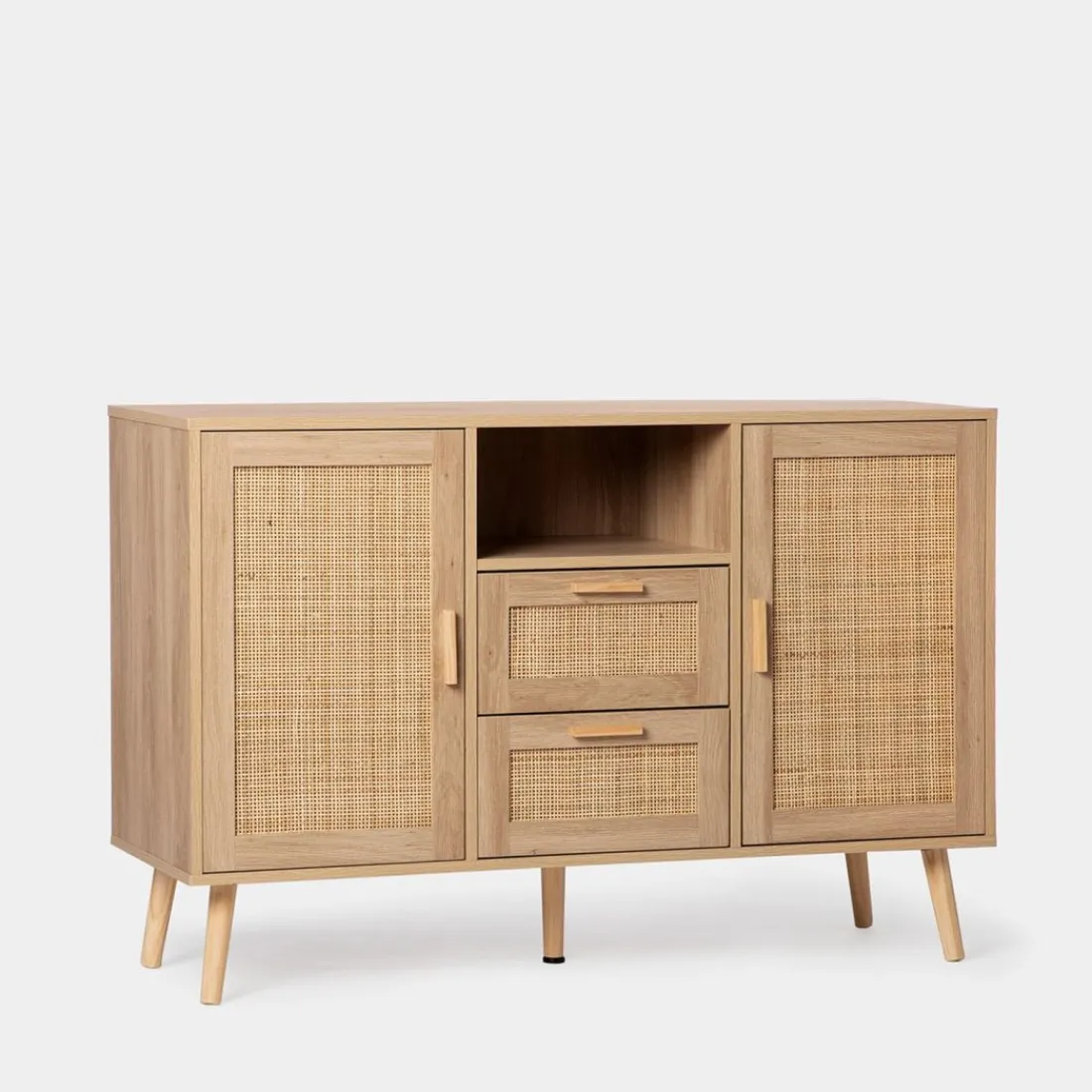 Consigue un plus de almacenamiento y estilo con el aparador en ratán natural Tahiti. Cuenta con dos puertas, dos cajones y un estante que permiten optimizar al máximo el espacio y mantener el orden en casa. Para mayor estabilidad del mueble, aconsejamos su anclaje a la pared. Combínalo con otras piezas de la colección y ¡consigue un efecto wow!
