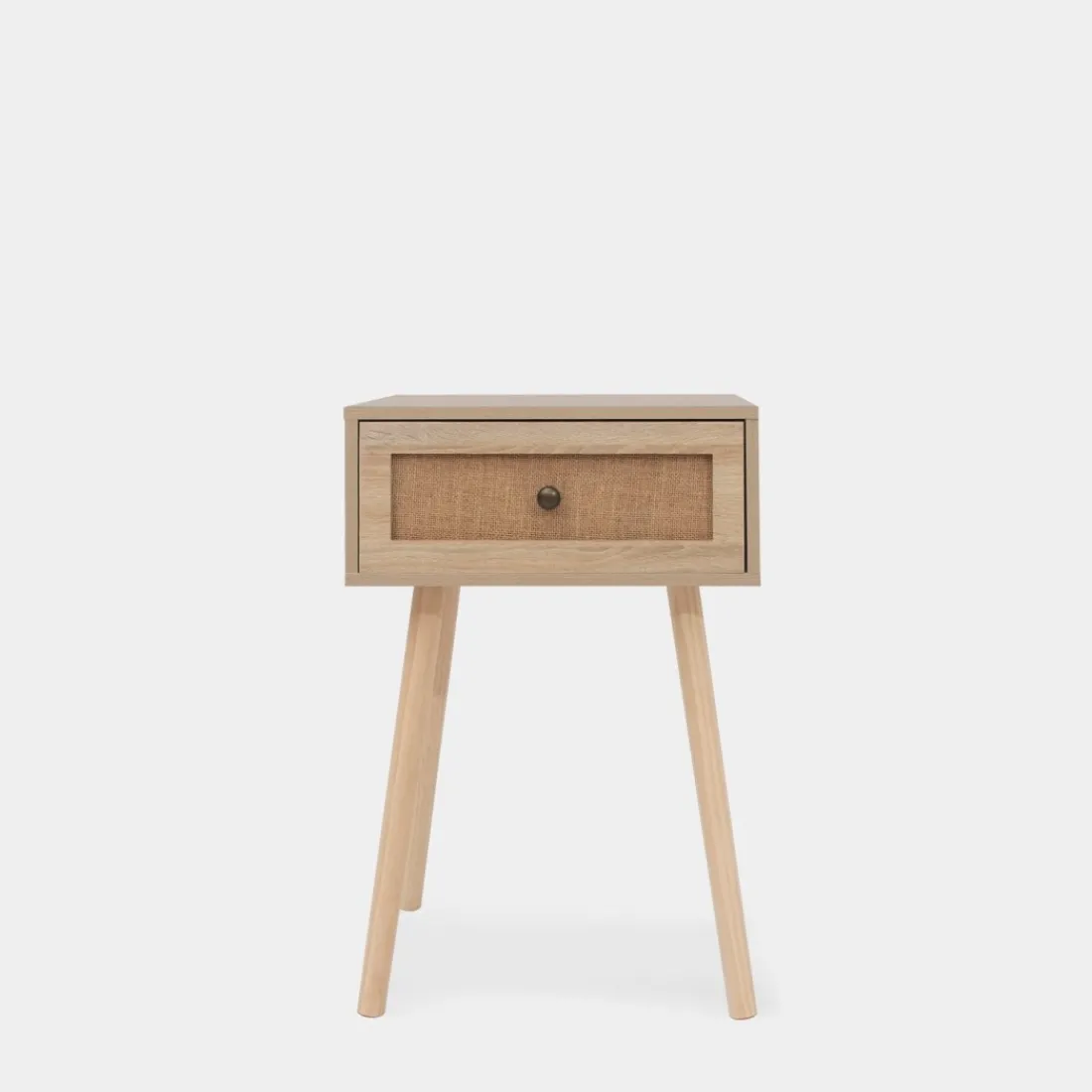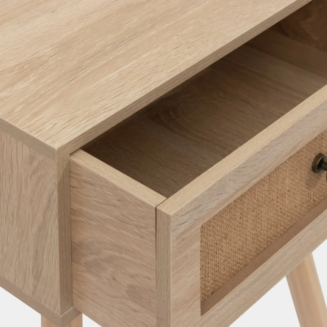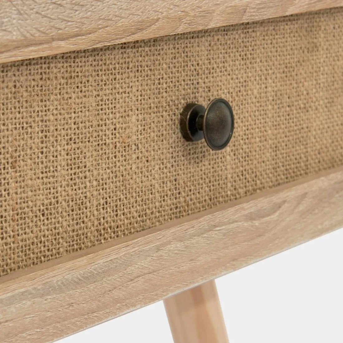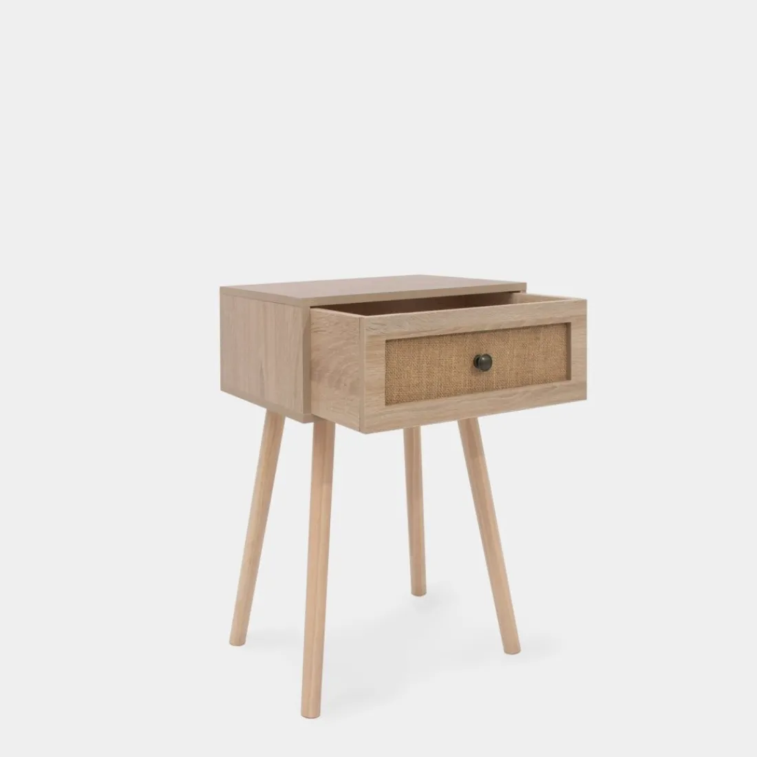 Añade un toque acogedor y cálido a tu dormitorio con la mesita de noche Tika, en madera color natural y fibra natural. Su diseño sencillo y atemporal permite combinarla fácilmente con cualquier estilo decorativo. Además, cuenta con un cajón espacioso, perfecto para mantener tus objetos personales organizados y siempre al alcance de la mano.