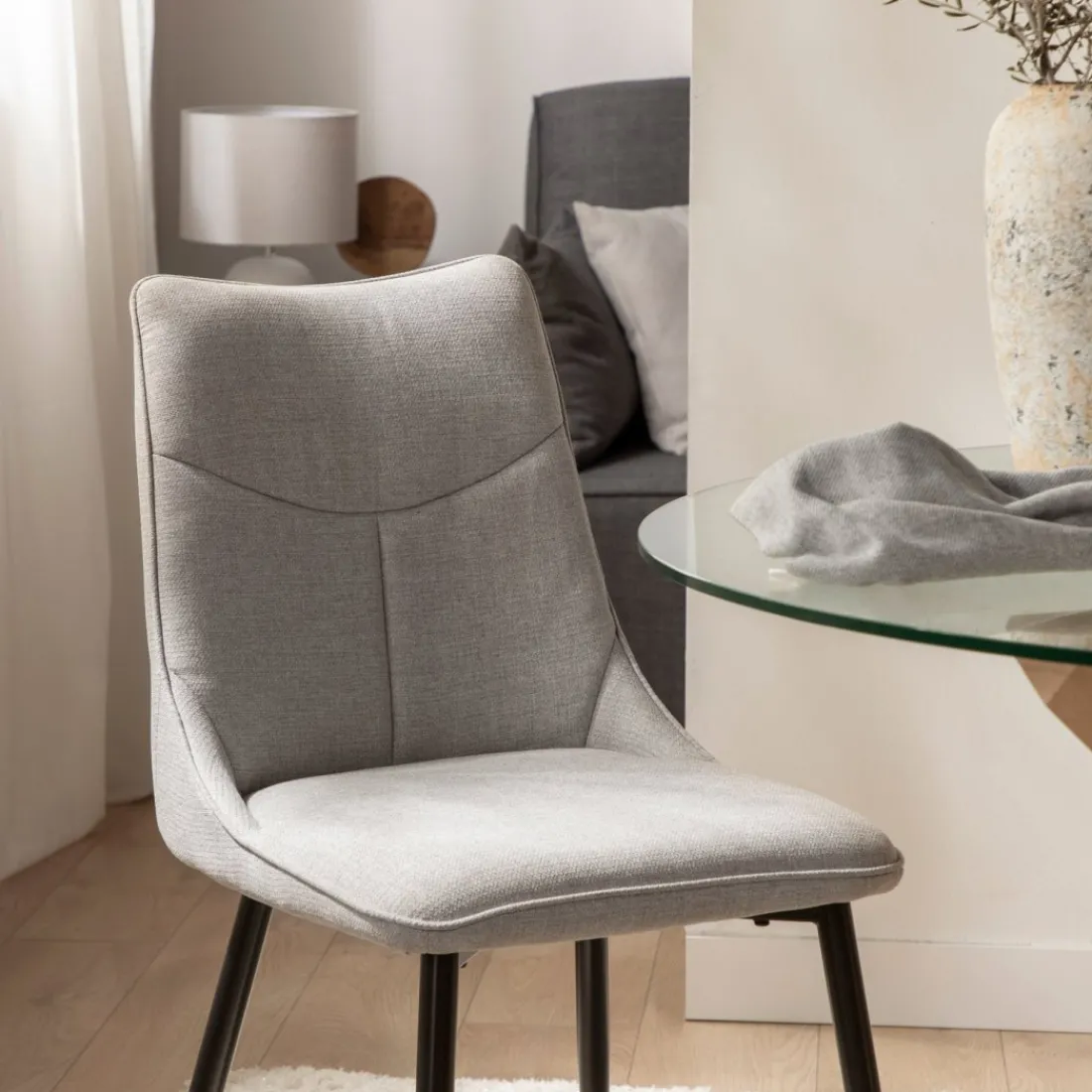 La silla de comedor Selma es la opción ideal para realzar la elegancia y comodidad en tu hogar. Con un tapizado en tono gris suave y patas negras, ofrece un estilo atemporal que se adapta sin esfuerzo a cualquier ambiente.