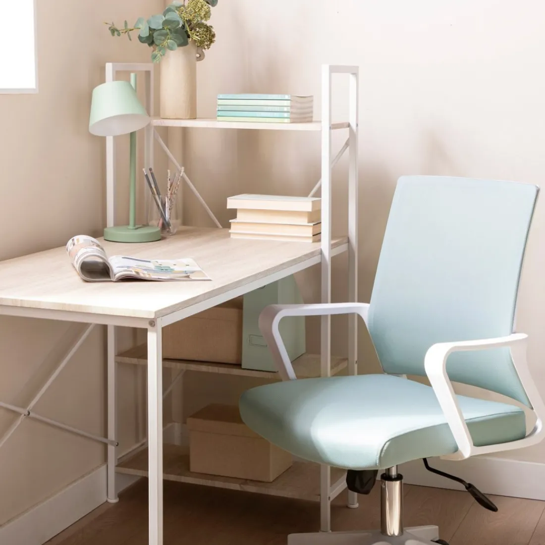 La silla de escritorio Sayla en color menta es ideal para completar el espacio de trabajo o estudio de tu casa. Se trata de una silla ergonómica que te permitirá trabajar cómodamente durante muchas horas. Cuenta con refuerzo lumbar, reposabrazos, altura de asiento regulable y ruedas giratorias. Disponible en varios acabados, escoge el que mejor encaje con tu estilo.