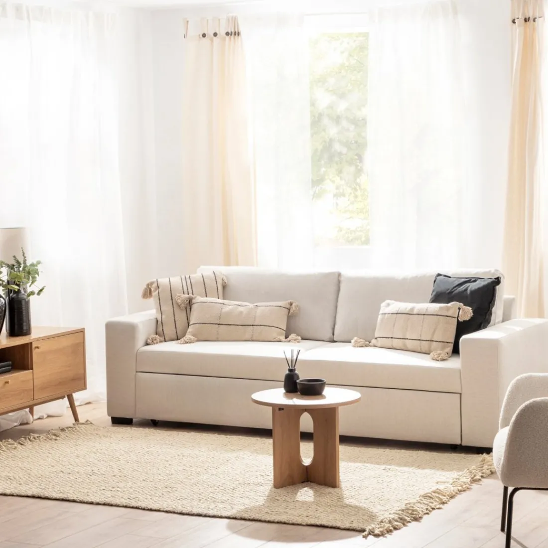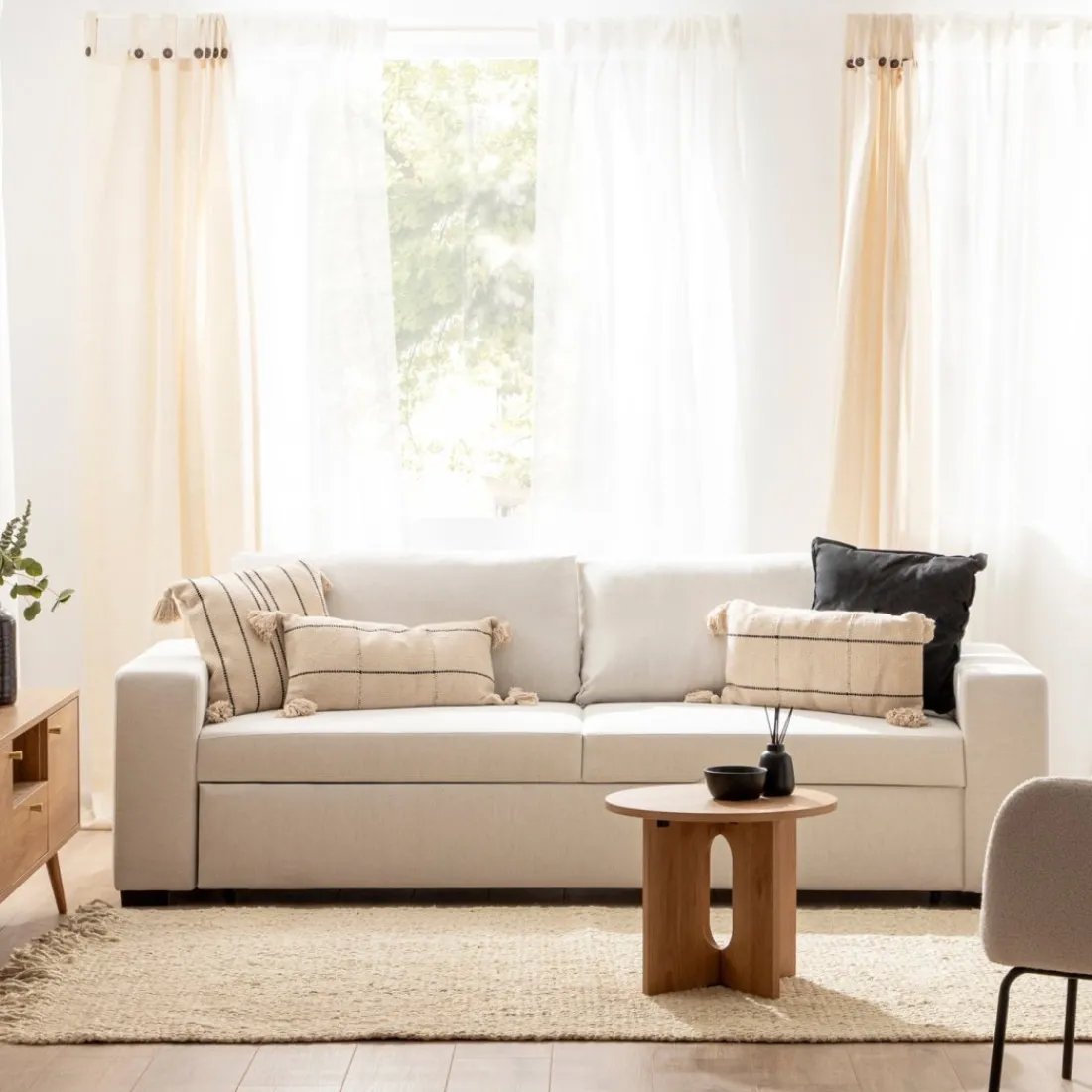 El sofá cama de 3 plazas en color beige Meryl es la combinación perfecta de estilo y funcionalidad. Este sofá no solo añade un toque de sofisticación a tu salón, sino que también ofrece una versatilidad incomparable gracias a su diseño convertible. En un abrir y cerrar de ojos, podrás transformar el sofá en una cama espaciosa, brindando una solución práctica y acogedora para alojar a tus invitados.