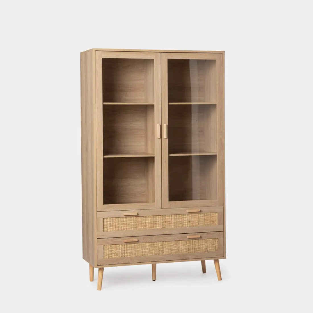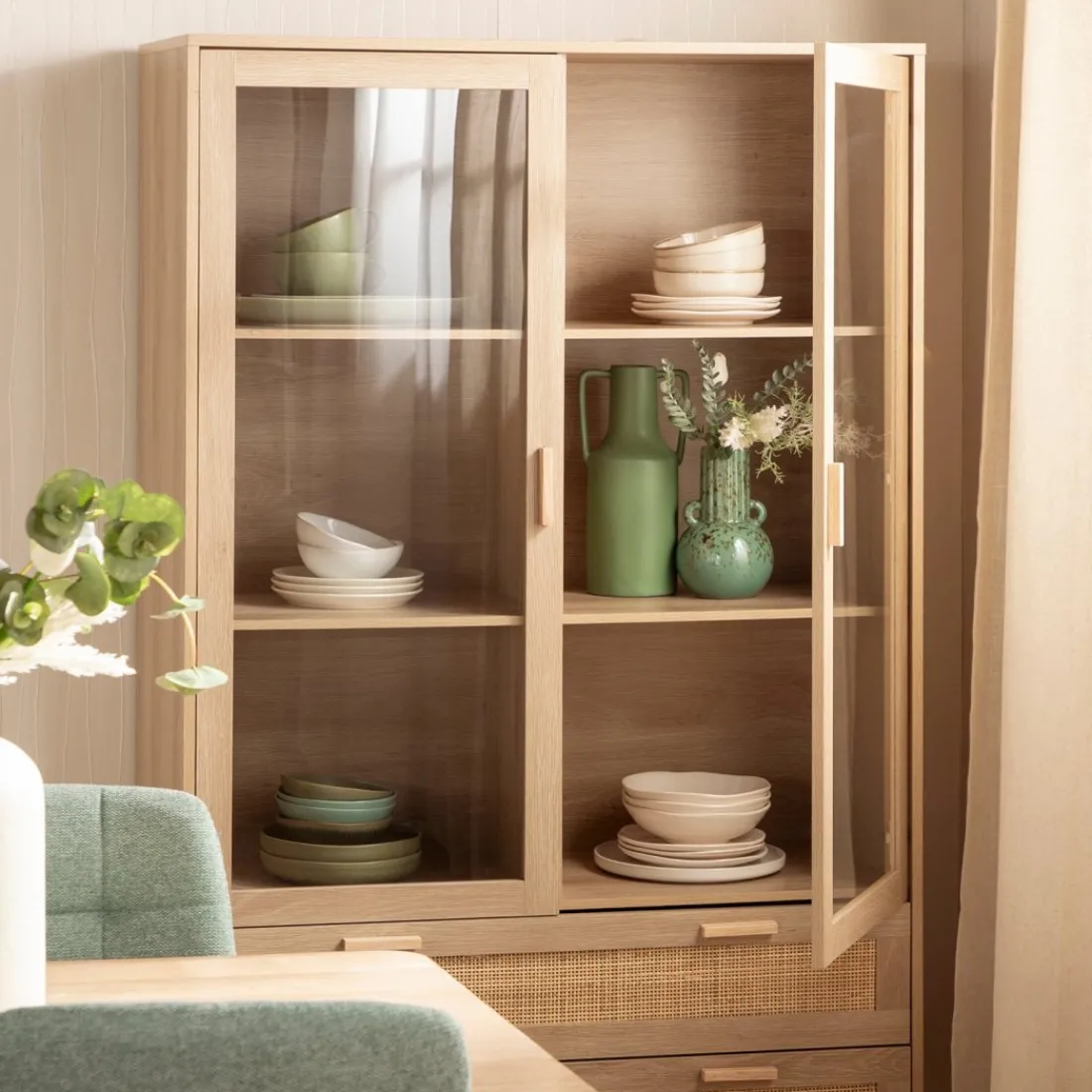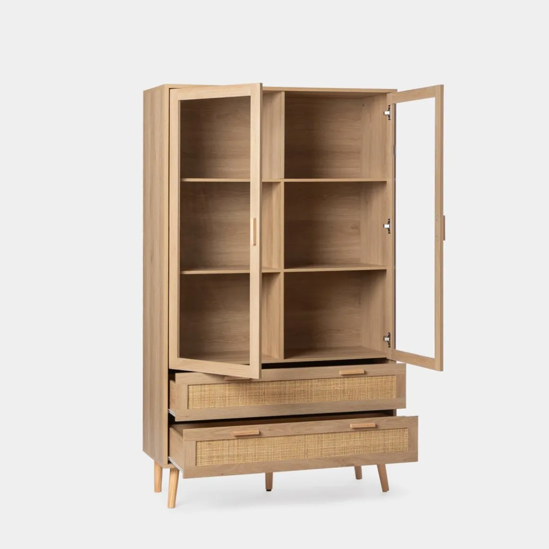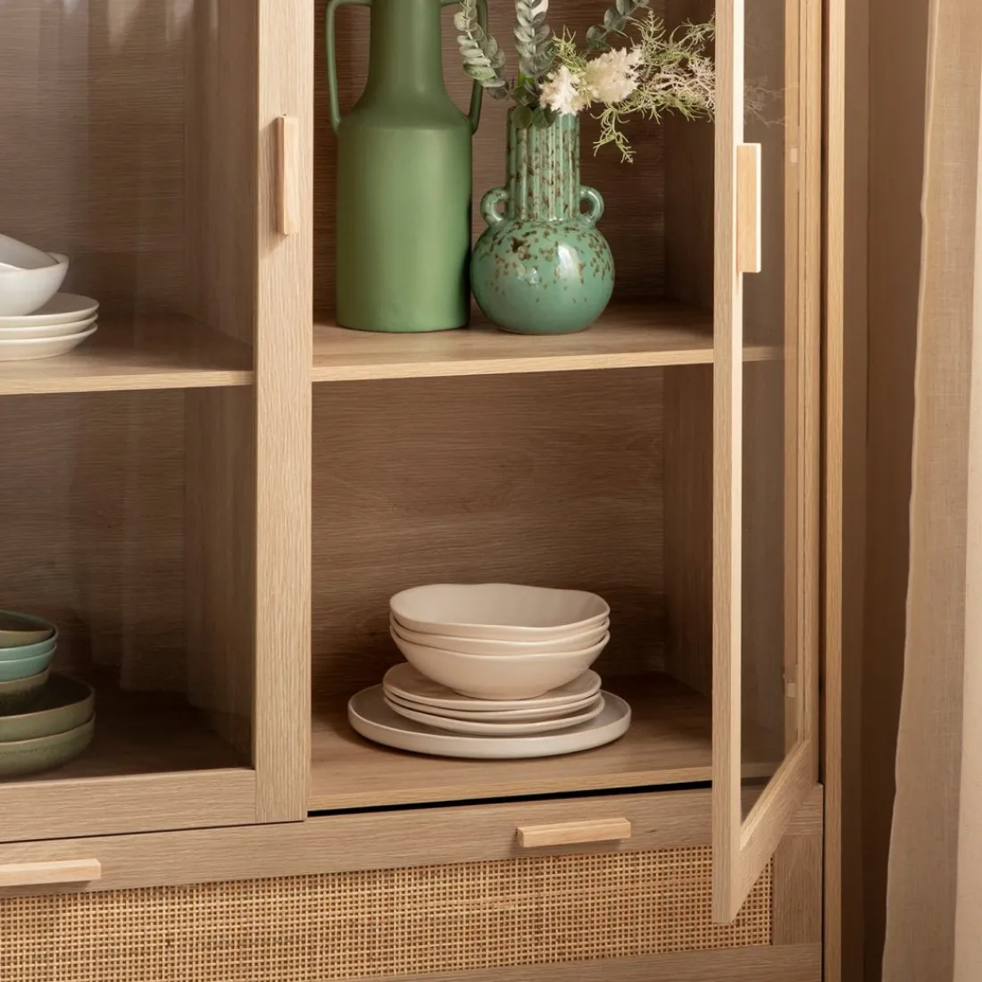 Transforma tu hogar con la vitrina en ratán natural Tahiti. Esta pieza no solo añadirá un toque acogedor y natural a tu hogar, sino que también ofrece funcionalidad. Cuenta con dos puertas acristaladas y tres estantes en los que podrás exhibir con estilo tu vajilla y cristalería favoritas. Además, sus dos cajones inferiores te brindan espacio extra para almacenar el menaje del hogar. ¡Haz que tu decoración destaque combinando esta vitrina con el resto de muebles de la colección y crea un efecto wow en tu hogar!