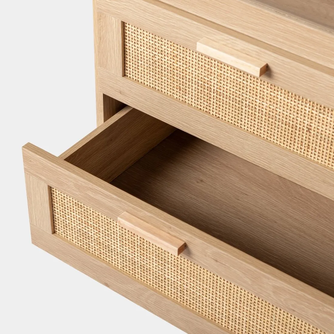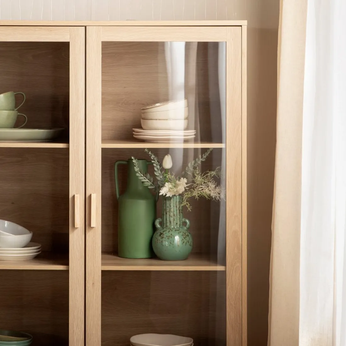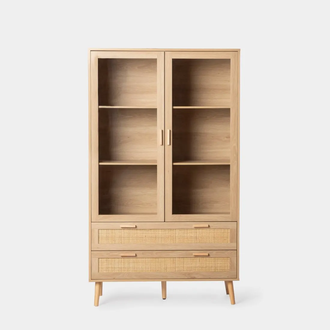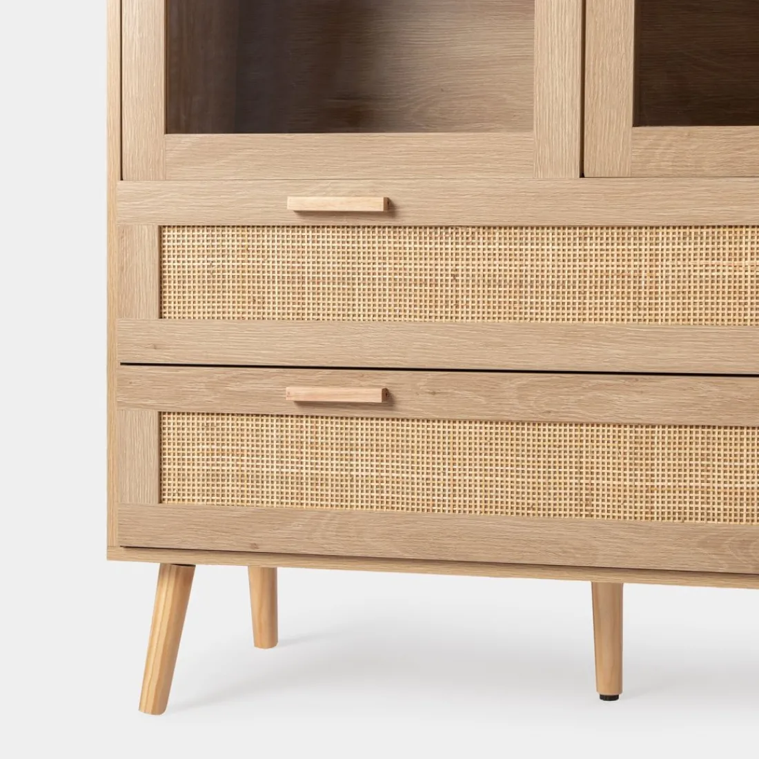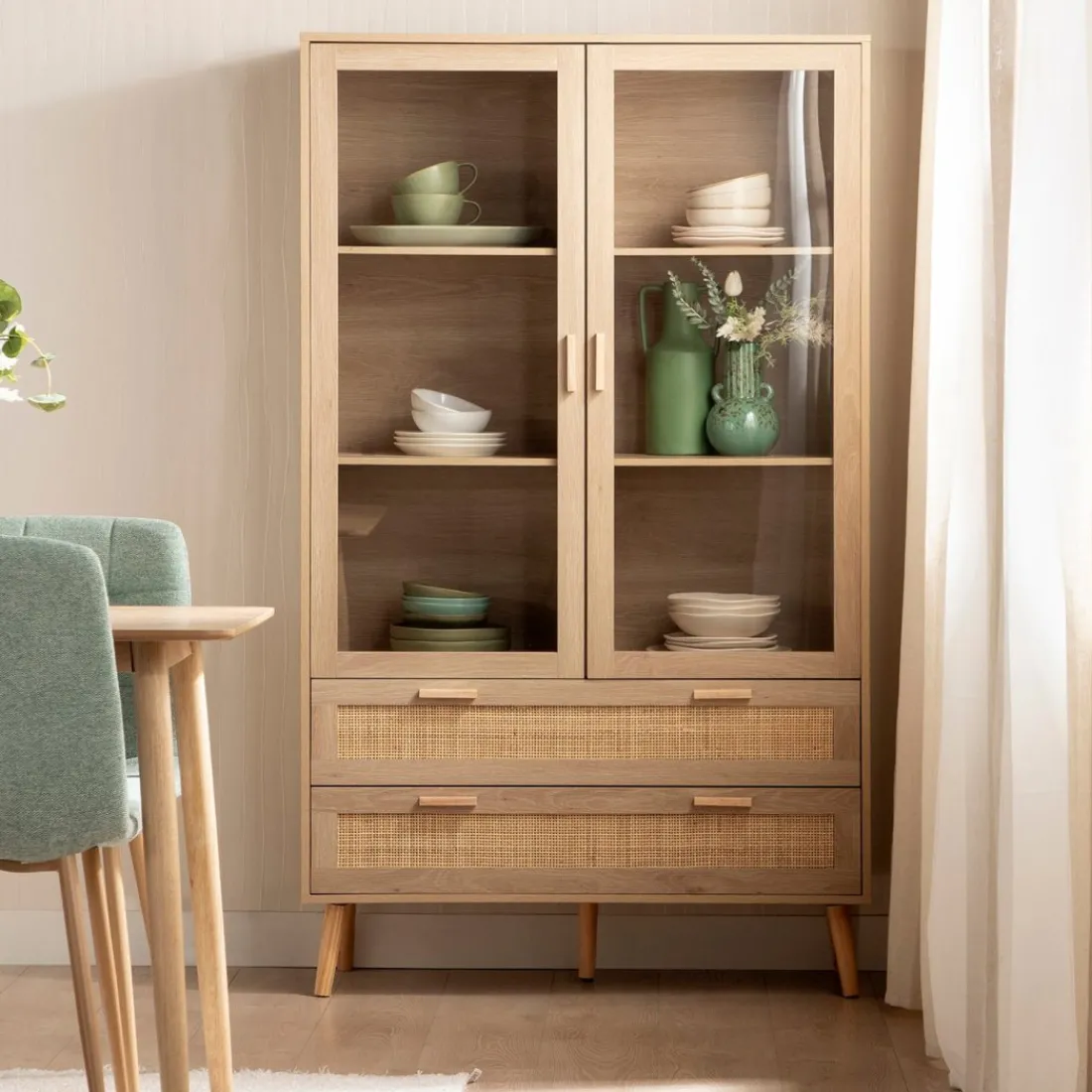 Transforma tu hogar con la vitrina en ratán natural Tahiti. Esta pieza no solo añadirá un toque acogedor y natural a tu hogar, sino que también ofrece funcionalidad. Cuenta con dos puertas acristaladas y tres estantes en los que podrás exhibir con estilo tu vajilla y cristalería favoritas. Además, sus dos cajones inferiores te brindan espacio extra para almacenar el menaje del hogar. ¡Haz que tu decoración destaque combinando esta vitrina con el resto de muebles de la colección y crea un efecto wow en tu hogar!
